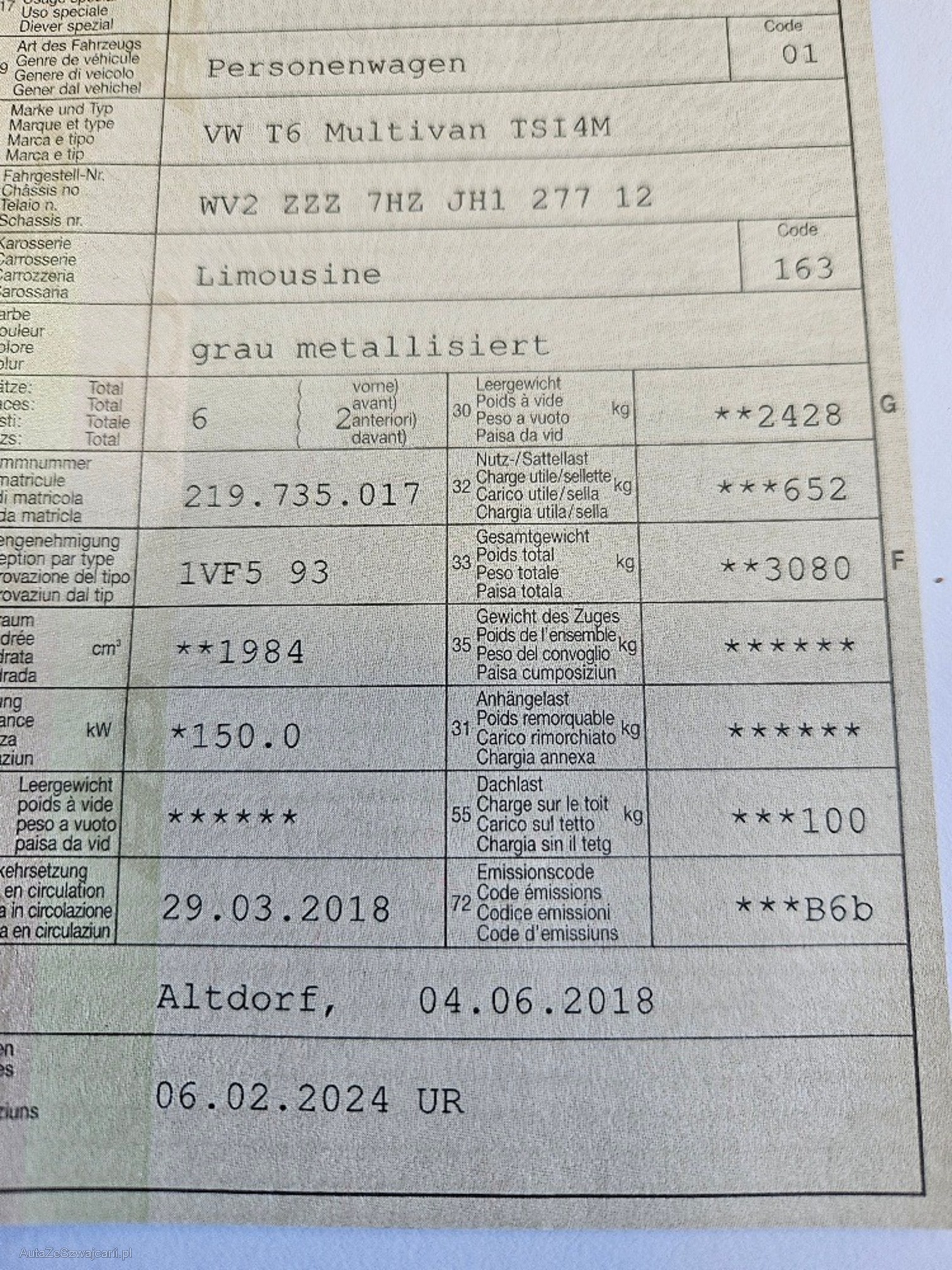 | Kommentar | Sehr gepflegter VW Bus mit Benzinmotor und sehr wenig Kilometer Beifahrersitz elektrisch bedienbar ist für einen Rollstuhlfahrer noch eingebaut. Originalsitz vorhanden mit allen Befestigungen. Kofferraum hätte ebenfalls Laderampe und Befestigung für Rollstuhl. Es sind aber alle Sitze vorhanden ( siehe Foto ) Für mehr Auskünfte bitte Telefon Es handelt sich dabei um ein Occasion Fahrzeug das Gebrauchsspuren aufweist. In der Regel wird kein detaillierter Werkstatttest an den Fahrzeugen gemacht. Jede Gewährleistung, soweit nach Gesetz möglich, wird wegbedungen, insbesondere sind Wandelung und Minderung ausgeschlossen. Der Käufer bestätigt mit seinem Gebot, dies anzuerkennen und verpflichtet sich, das ersteigerte Fahrzeug umgehend gegen Barzahlung abzuholen. Der Preis ist fix und nicht mehr verhandelbar! Es wird grundsätzlich kein Werkstatttest durchgeführt. Nach Zuschlag muss das Fahrzeug innerhalb 5 Tage abgeholt werden, ansonsten werden Standgebühren von Fr. 20.- pro Tag verrechnet |