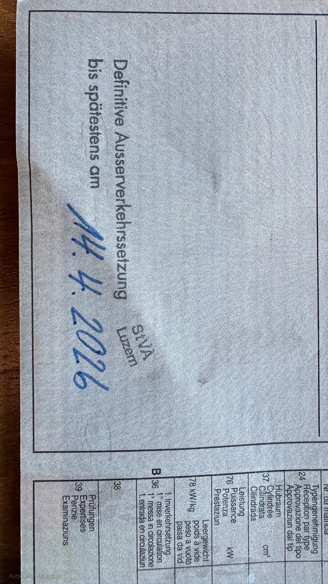 | Kommentar | Am Fahrzeug wurde keine technische Kontrolle durchgeführt! Das Fahrzeug hat den Eintrag definitive Ausserverkehrsetzung bis am 14.04.2026 (siehe Bilder) Der technische und mechanische Zustand ist nicht bekannt! Das Fahrzeug wird gemäss Fotos verkauft! Fahrzeug ab Platz und ohne Garantie! Keine Nachverhandlung mehr möglich nachdem der Zuschlag erteilt wurde! |