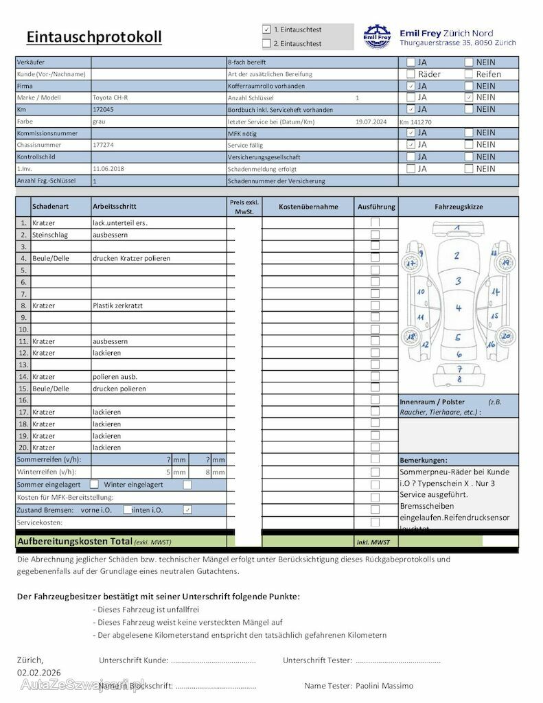 | Information | Keine technische Prüfung (Werkstatttest) vorgenommen Diverse Schäden an Karosserie/Lack. Fahrzeug ab Platz, ohne Garantie und Aufbereitung. DPF/FAP Filter nicht kontrolliert Keine Gewähr auf die Angaben der Sonder- und Serienausstattung / keine mechanische Prüfung. Fahrzeug wurde unzerlegt expertisiert / keine Haftung für allfällige, nach Demontage bekanntwerdenden Mängel. Fahrzeugbereifung und Ausstattung gemäss Fotos / Fahrzeugkauf auf eigenes Risiko ab Platz ohne Nachwährschaft. - Div. Kratzer und Dellen am gesamten Fahrzeug. |