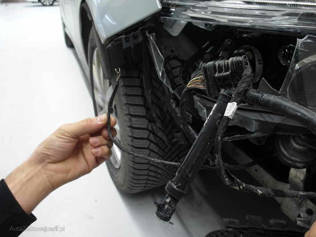 Kollision mit Pfosten, Front rechts beschädigt, Kotflügel r verformt, Deckel v verformt, Fussgängerschutz ausgelöst, Scheinwerfer r defekt, Längsträger r oben verformt, Front innen verformt