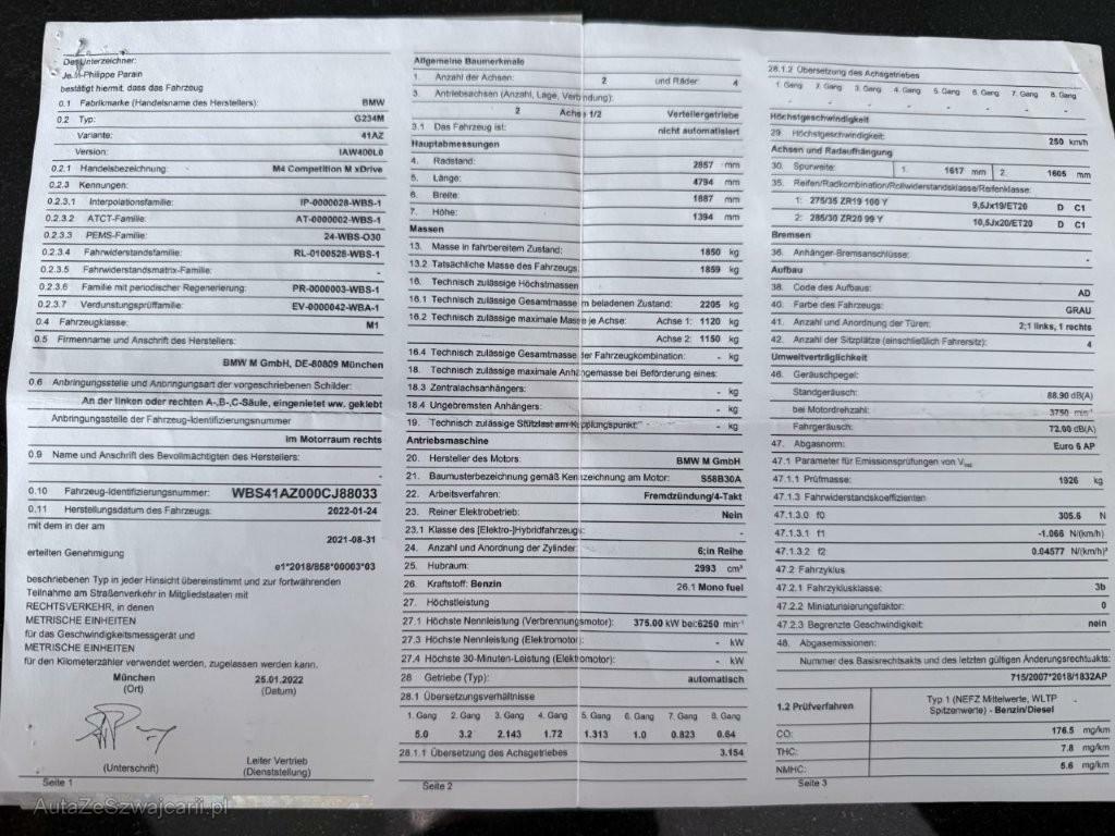 | Serienausstattung | Paket: Innen- und Aussenspiegelpaket, Assist: Park Distance Control vorne und hinten, Servotronic, Media: HiFi Lautsprechersystem - Digitaler Verstärker, 205 W Verstärkerleistung 10 Lautsprecher: - 1 Mitteltöner in der Armaturentafel - 3 Hochtöner in den Spiegeldreiecken und der Instrumententafel - 4 Mitteltöner in den Türverkleidungen vorne und hinten - 2 Zentralbässe unter den Vordersitzen, Getriebe: 8-Stufen-Sportautomat Steptronic, Alarmanlage, Aussenspiegel rechts und links beheizt und elektrisch verstellbar, asphärisch gewölbtes Spiegelglas, Fahrwerk: M Sportdifferential - Aktives M Differenzial - M spezifisch abgestimmtes, elektronisch geregeltes Hinterachs-Lamellensperrdifferential mit zusätzlichen Kühlrippen an Gehäuseunterseite - vollvariable Einstellung des Sperrgrads, je nach Fahrsituation und Fahrbahnbeschaffenheit zwischen 0 und 100%. Verbesserung von Traktion, Agilität, Stabilität sowie Fahrverhalten: - Traktion: Zuweisung von 'mehr Drehmoment' auf das Rad mit besserer Bodenhaftung - Agilität: gesteigertes Querbeschleunigungs- und Fahrdynamikpo, Fahrwerk: Adaptives M Fahrwerk - M spezifische Regelung der Stoßdämpfer Charakteristik. Einstellbar in die Modi 'Comfort', 'Sport' und 'Sport Plus' - Vorderachse: M spezifische Doppelgelenk-Federbeinvorderachse - Hinterachse: M spezifische 5-Lenker-Hinterachse, BMW Garantie: BMW Service Plus - Gewährleistung und Gratis-Reparatur bis 100'000 km oder 3 Jahre. Es gilt das zuerst Erreichte - Verschleissreparaturen, wie Ersatz von Bremsbelägen und Bremsscheiben, sowie sonstige Reparaturen übernehmen wir mit BMW Originalteilen während 100'000 km oder 3 Jahren. Zudem profitieren Sie von bis zu sechs saisonalen Räderwechseln (zwei pro Jahr) und dem Austausch der Wischerblätter. - Gratis-Service bis 100'000 km oder 10 Jahre. Es gilt das zuerst Erreichte,, Elektrische Fensterheber vorne, Warndreieck, Start-/Stop-Knopf, Licht: Nebelschlussleuchte, Lenkrad: Lenkrad längs- und höhenverstellbar, Dach in CFK Optik, Ambientes Licht - Mit Ambiente-Lichtdesigns - Umfasst 11 vordefinierte wählbare Lichtdesigns in 6 Farben (Orange, Grün, Blau, Flieder, Bronze und Weiss) - Ambiente Wasserfallbeleuchtung - Ambiente Fussraumbeleuchtung - Ambiente Kartentaschenbeleuchtung - Ambiente Ablagefachbeleuchtung der Mittelkonsole - Konturbeleuchtung in Instrumententafel und Türverkleidung - Ambiente Türöffnerbeleuchtung, Intelligenter Notruf, Sitze: M Sportsitze vorne, Auto Start Stop Funktion, Airbag: Airbag Fahrer und Beifahrer, M Hochglanz Shadow Line mit erweiterten Umfängen - Außenspiegelkappen und Heckspoiler in Schwarz Hochglanz - Endrohrblenden in Schwarzchrom, Elektronische Wegfahrsperre, Scheibenwaschdüsen beheizt, Schaltpunktanzeige, Parkbremse, elektromechanisch, Leuchtweitenregulierung, Innenspiegel, automatisch abblendend Abblendsteuerung mittels eingebauter Sensorik, die das von hinten einfallende Licht misst und bei berechneter Blendung den Innenspiegel entsprechend abblendet, Media: Freisprecheinrichtung mit USB-Schnittstelle, Innenbeleuchtung, Paket: Connected Package Professional, Räder: Radschraubensicherung, Media: DAB+ Tuner, BMW Garantie: Repair Inclusive - 3 Jahre/100.000 km Gültigkeit: 3 Jahre oder 100.000 Kilometer - es gilt das zuerst Erreichte, Antiblockiersystem (ABS), Media: BMW Live Cockpit Professional - Anzeigeverbund bestehend aus einem volldigitalem 12,3" Instrumentendisplay und einem hochauflösendem 10,25" Control Display - BMW Operating System 7, Navigationsfunktion - Intuitive Bedienmöglichkeiten wahlweise über den BMW Intelligent Personal Assistant - Persönliches Nutzerkonto Vierfach-Tuner mit Diversity-Empfang, RDS und TMC - 2 USB-Anschlüsse zum Laden und zur Übertragung von Daten, Bluetooth/WiFi-Schnittstelle - 4G LTE Connectivity: festverbaute SIM-Karte mit 4G Netz, Active Guard, Sitze: Sitzheizung für Fahrer und Beifahrer, Katalysator geregelt, 3-Punkt-Sicherheitsgurte auf allen Plätzen, Airbag: Airbag Beifahrer deaktivierbar, Räder: Reifendruck-Kontrollanzeige, Media: ConnectedDrive Services, Lenkrad: M Lederlenkrad, Klima: Klimaautomatik - 3-Zonen-Klimaautomatik mit erweiterten Umfängen - Beschlag- und Solarsensor - Aktivkohlefilter für Frisch- und Umluft - Standlüftung mit Timer und Direktbetrieb - Digitales Display Mittelkonsole hinten, Lenkrad: Multifunktionslenkrad, Speed Limit Info, Airbag: Seitenairbag für Fahrer und Beifahrer, Regensensor, M Drive Professional - M Track Mode - M Laptimer - M Traction Control (10-stufig) - M Drift Analyser, Licht: Begrüssungslicht, Paket: Ablagenpaket Innenraum: Klappfach Instrumententafel unten, Fahrerseite Gepäckraum: - Trennetz an Seitenverkleidung links/rechts - Taschenhaken beidseitig im Gepäckraum - zusätzliche 12V Steckdose, Assist: Crash-Sensor, Sitze: Lordosenstütze für Fahrer und Beifahrer - Verstellung von Höhe und Tiefe in der Rückenlehne, Assist: Geschwindigkeitsregelung mit Bremsfunktion Geschwindigkeitsregelung ab ca. 30 km/h auch bei Bergabfahrten durch zusätzlichen Bremseingriff, Bedienung über Multifunktionslenkrad, Anzeige der Wunschgeschwindigkeit und des Betriebsmodus in der Instrumentenkombination, Fahrer kann Funktion jederzeit übersteuern., Räder: Reifen Pannen Anzeige, Getränkehalter, Dekor: Interieurleisten schwarz hochglänzend mit Akzentleisten Perlglanz Chrom, Seitenaufprallschutz, Einstiegsleisten, BMW Mobile Care - BMW Mobile Care: Pannen- und Unfallhilfe - Die BMW Pannen- und Unfallhilfe ist an 365 Tagen im Jahr rund um die Uhr im In- und Ausland für Sie da und das bis zu fünf Jahre nach der Erstzulassung Ihres Fahrzeugs., Sitze: Durchladesystem, Licht: Heimleuchten, Dynamische Stabilitäts Control (DSC) mit erweiterten Umfängen, Kennzeichenbeleuchtung in LED, Polster: Leder Merino mit erweiterten Umfängen Schwarz, Räder: 19"/20" M Schmiederäder Doppelspeiche 826 M Schwarz - mit Mischbereifung voren: 9,5J x 19, 275/35 R19 hinten: 10,5J x 20, 285/30 R20, Airbag: