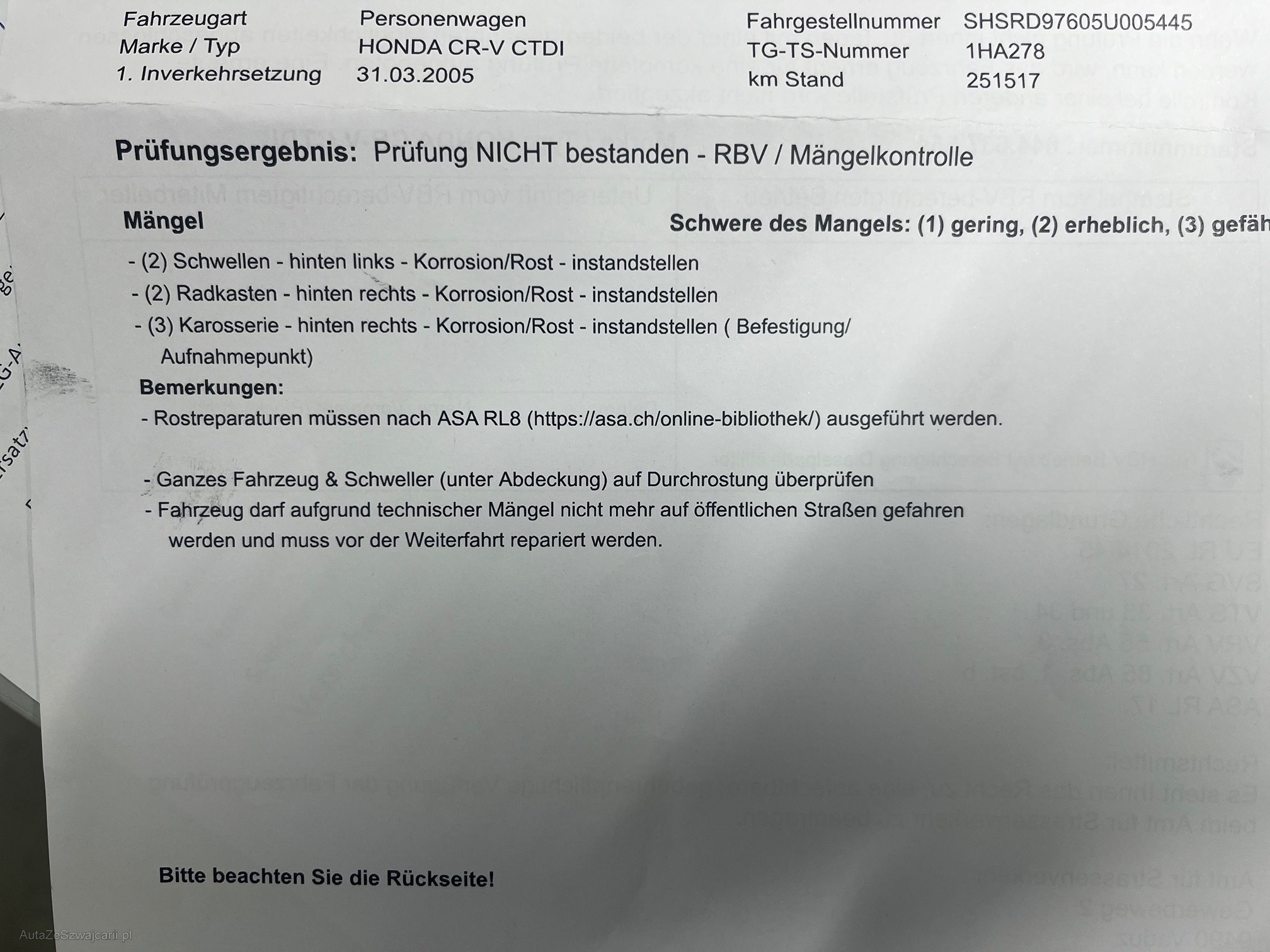 | Kommentar | Auto hat innen und aussen viele Gebrauchsspuren, Siehe Fotos. MFK Mängel siehe Mängelliste. Sollte aufgeladen werden da Hinterachsaufnahme zum Chassis durchgerostet ist. Fahrzeug ist mechanisch in gutem Zustand. Wir führen keine umfassenden Prüfungen oder Kontrollen sämtlicher Fahrzeugfunktionen durch. Offensichtliche Mängel werden, soweit erkennbar, benannt, jedoch unterziehen wir das Fahrzeug keinem detaillierten Werkstatttest. Daher übernehmen wir keine Haftung für sichtbare oder unsichtbare Mängel. Zur Vermeidung von Missverständnissen kann das Fahrzeug nach vorheriger Terminvereinbarung besichtigt, getestet und Probegefahren werden. Nachverhandlungen, jegliche Garantie, Wandelung und Minderung werden ausgeschlossen. |