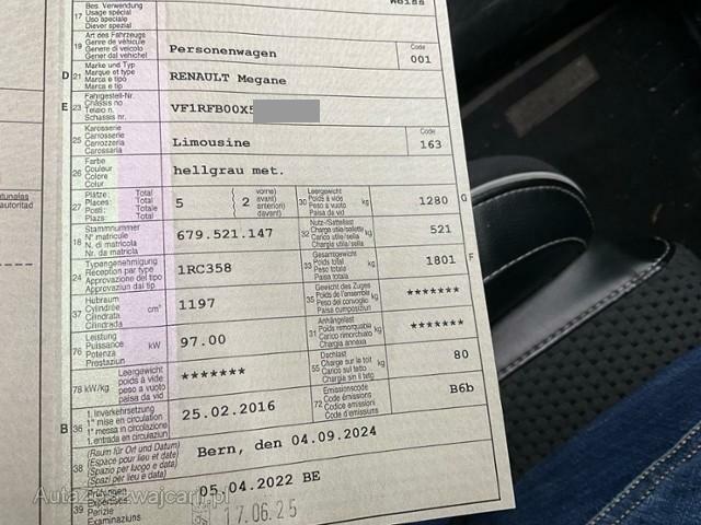 | Condition_and_Equipment | Demontage Persönliche Gegenstände oder Ladegut im Fahrzeug werden entfernt. Bereifung Fahrzeug wird mit Winterräder abgegeben. Zweiter Radsatz vorhanden --- Front Front rechts eingedrückt. Motorhaube Hagelschaden Heck Heckdeckel Hagelschaden. Motor Klimakondensator ist eingedrückt. Achse Risiko Vorderachse. Dach Hagelschaden am Dach. Sonstige Schäden Div.Carrosserie Teile sind leicht beschädigt. Div. Roststellen am Fahrzeug. Lackierung matt (stumpf, beschädigt). Hagel Hagelschaden leicht. --- Serienaustattung Airbag Fahrer und Beifahrerseite Elektrische Fensterheber vorne Aussenspiegel elektrisch verstellbar und heizbar Seitenairbag Fahrer und Beifahrerseite Nebelscheinwerfer Mittelarmlehne hinten Elektrische Fensterheber hinten Deaktivierung Beifahrerairbag Windowbags vorne + hinten ABS und EBV Elektr. Bremskraftverteilung inkl. BA Zwei Zonen-Klimaautomatik Tempomat mit Geschwindigkeitsbegrenzer Automatisch abblendbarer Innenspiegel Dunkle Verglasung hinten Regen- und Lichtsensor Kindersitzverankerung ISOFIX hinten Sitzbezüge in Stoff/ Kunstleder Automatische Parkbremse Renault Chipkarte Keyless-Drive Hands-free Licht- und Regensensor Berganfahrhilfe Fahrersitz höhenverstellbar Beifahrersitz höhenverstellbar Reifenreparatur-Kit Stop + Start System LED-Scheinwerfer LED Tagfahrlicht Aussenspiegel elektrisch einklappbar Sitzbank hinten 1/3 - 2/3 umklappbar Sitz mit Massagefunktion/ vorne links Leichtmetallfelgen 17" schwarz Spurhalteassistent LDW Details siehe gültige Preisliste des Importeurs Einparkhilfe vorne und hinten mit Rückfahrkamera Keine Gewähr auf die Angaben der Serienausstattungen Multifunktionslenkrad Leder DAB+ Digital Audio Broadcast Adaptiver Fernlichtassistent Digitale Instrumentierung ASR und ESC/ Antriebsschlupf- und Stabilitätsprogramm Fahrersitz mit Lendenwirbelstütze verstellbar Verkehrsschild-Erkennungssystem R-Link/ Media-Navi Bose |