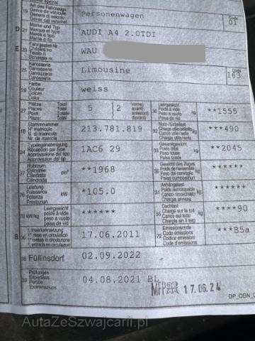 | Condition_and_Equipment | Zustand Fahrzeug ist rollbar. Sonstiges Fahrzeugdokumente vorhanden. --- Links Linke Seite beschädigt. Heck Seitenwand hinten links eingedrückt/ausgestaucht. Achse Hinterachse links beschädigt. Innenraum Innenraum ungepflegt. Sonstige Schäden Div.Carrosserie Teile sind leicht beschädigt. Lackierung matt (stumpf, beschädigt). --- Serienaustattung Lederlenkrad 4-Speichen Aussenspiegel elektrisch verstellbar und heizbar Radio Chorus Airbag Fahrer und Beifahrerseite Seitenairbag Fahrer und Beifahrerseite Zentralverriegelung mit Fernbedienung Elektronische Wegfahrsperre Servotronic Lenksäule mit Höhen- und Längseinstellung Seitliches Kopfairbagsystem SIDEGUARD Elektrische Fensterheber vorne + hinten Reserve-Notrad Tagesfahrlichtschaltung Aussenspiegel in Wagenfarbe ABS und EBV Elektr. Bremskraftverteilung Bremsassistent EBA ESP Elektronisches Stabilitätsprogramm ASR und EDS Antriebsschlupfregelung und Differrentialsperre Vordersitze höhenverstellbar Wärmeschutzverglasung Dieselpartikelfilter DPF Elektromechanische Parkbremse Fahrerinformationssystem Normalsitze vorne Dekoreinlagen in Mikrometallic Klimaautomat mit Staub und Pollenfiter Mittelarmlehne hinten Leichtmetallräder 16" 6-Arm Design 225/55 CD6 Sitzbezüge in Stoff Cosinus Keine Gewähr auf die Angaben der Serienausstattungen Sonderausstattung Mittelarmlehne vorne mit aufklappbarem Staufach Park-System hinten Audi music interface Pack Infotainment Sonstige Ausstattung und Zubehör Scheiben ab B-Säule abgedunkelt |