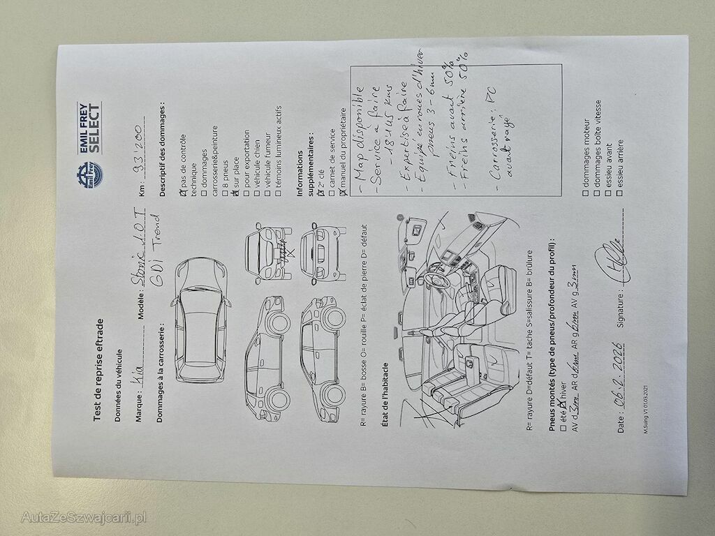 | Information | 2 clés Map disponible Service à faire -18145 kms Expertise à faire Equipé en roues d'hiver pneus 3 et 6 mm Freins avant 50 % Freins arrière 50 % Carrosserie : Pare-chocs avant rayé Pas de contrôle technique (essai en route) effectué |