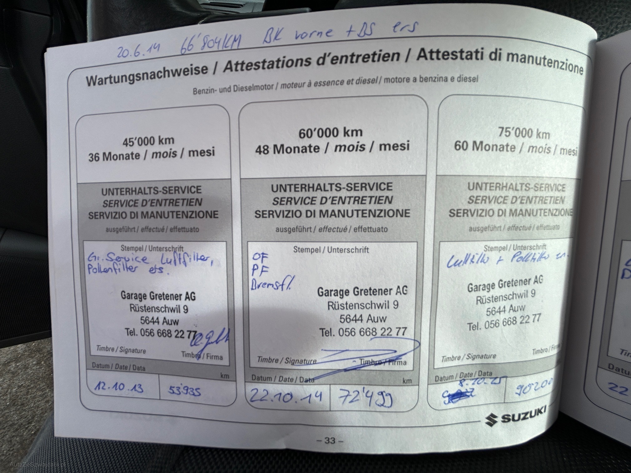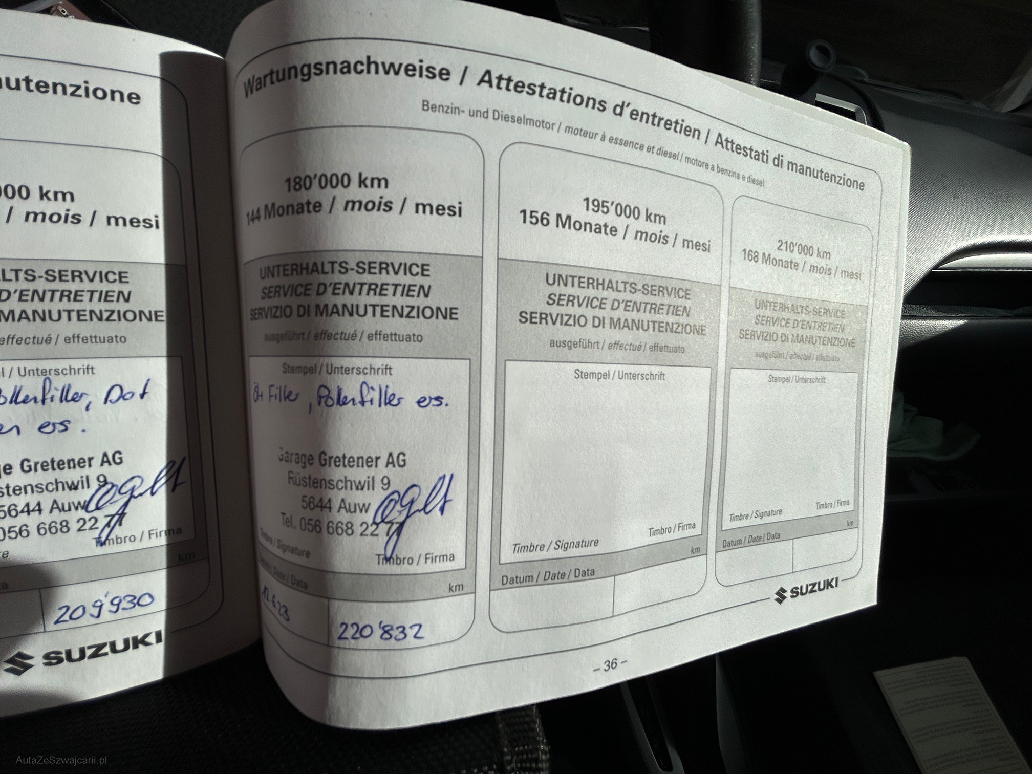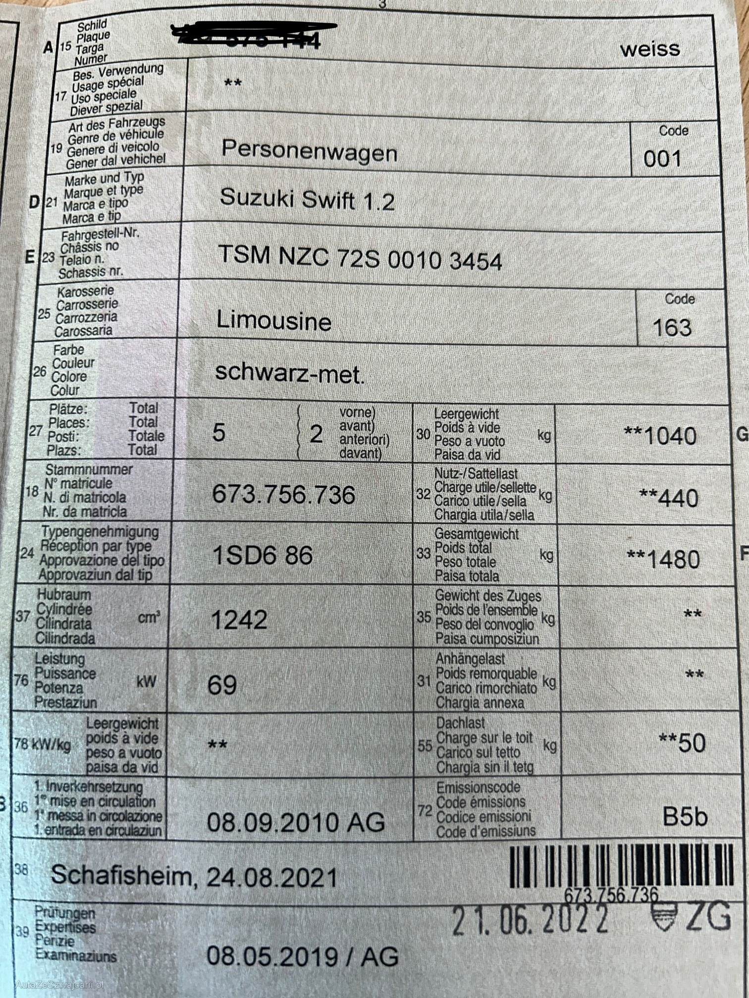 | Kommentar | Es wurde kein Werkstatt-Test durchgeführt. Fahrzeug hat starken Hagelschaden (Fotos). |