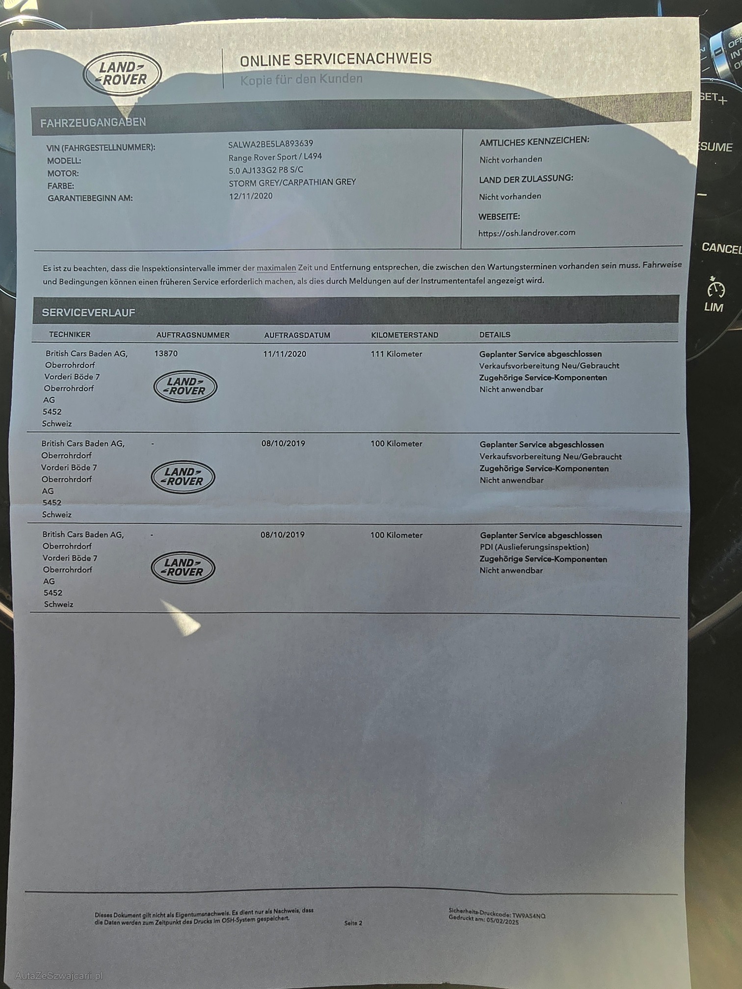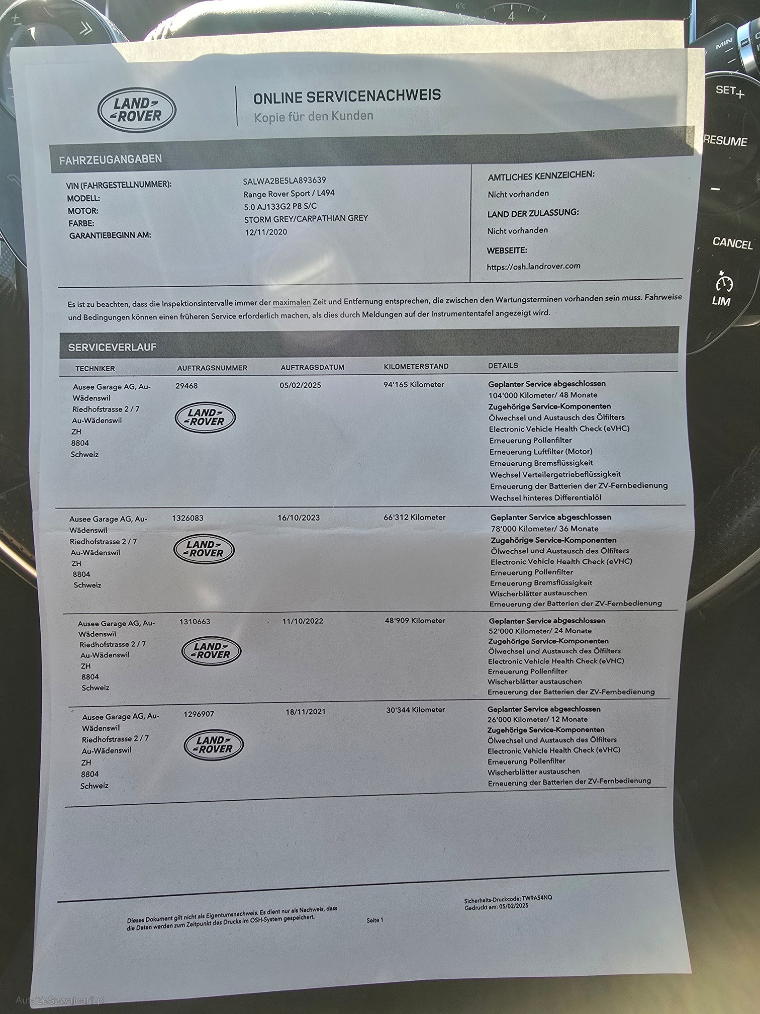 | Kommentar | Das perfekte Zugfahrzeug mit echtem V8 aus erster Hand! Bremsen vorne ca. 30% Bremsen hinten ca. 30% Sommerräder Original vorhanden und mit Sommerreifen bereift (ca. 4mm) Winterräder wie abgebildet mit Winterreifen (5mm) (Montiert sind Winterfelgen) Fahrzeug hat kleinere Gebrauchsspuren (siehe Bilder) und ist aus erster Hand. Letzter Service am 05.02.2025 bei 94'165km. (offizieller Service siehe Bilder) Anschlussgarantie laut Land Rover möglich bis Ende 2026. Am Fahrzeug wurde kein Werkstatttest gemacht. (Für sichtbare oder nicht sichtbare Mängel wird nicht gehaftet) Wir testen & kontrollieren nicht alle Funktionen des Fahrzeugs. Das Risiko liegt somit vollumfänglich beim Käufer. Ab Platz, ohne Garantie, Wandelung und Minderung werden wegbedungen. |