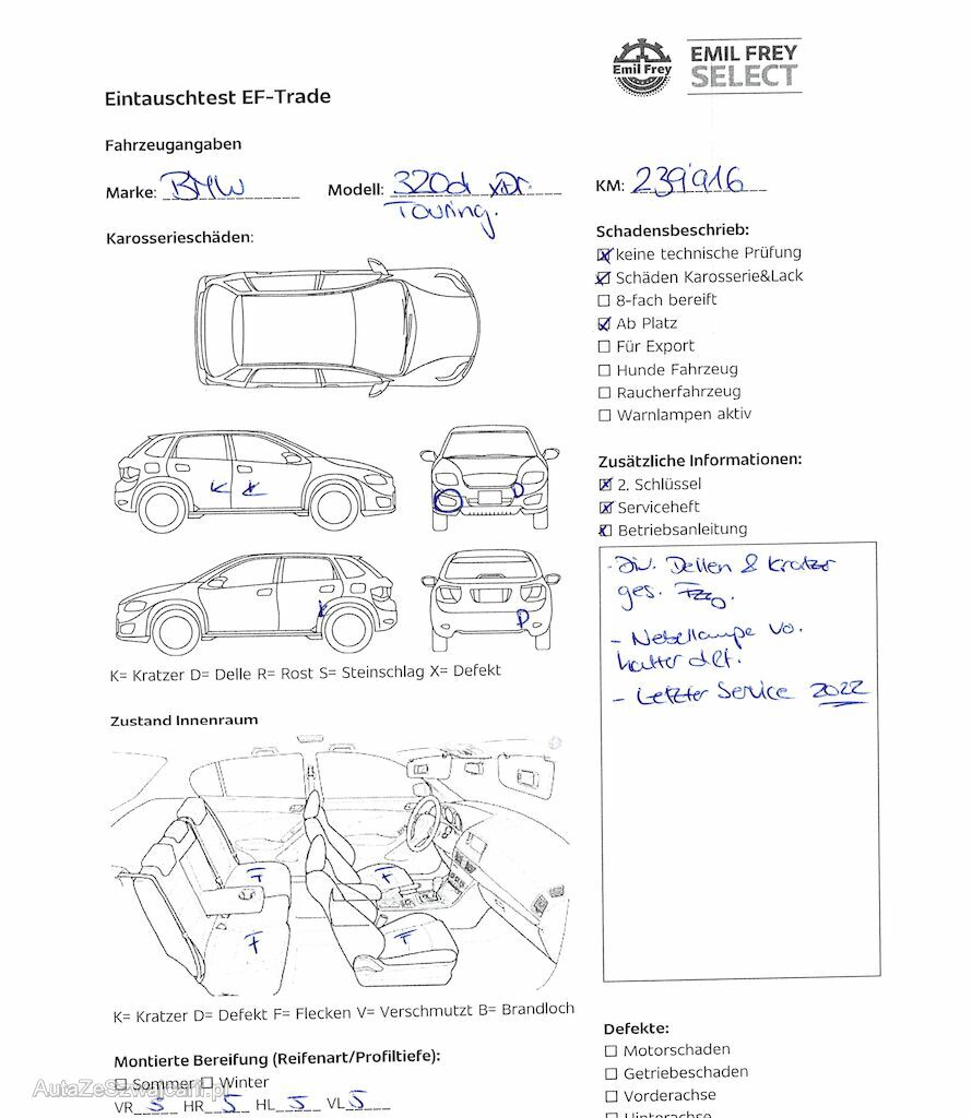 | Information | Keine Gewähr auf die Angaben der Sonder- und Serienausstattung / keine mechanische Prüfung. Fahrzeug wurde unzerlegt expertisiert / keine Haftung für allfällige, nach Demontage bekanntwerdenden Mängel. Fahrzeugbereifung und Ausstattung gemäss Fotos / Fahrzeugkauf auf eigenes Risiko ab Platz ohne Nachwährschaft. - Div. Dellen und Kratzer am gesamten Fahrzeug. - Nebellampenhalter vorne rechts def. - DPF frisch ersetzt und geprüft. - Letzter Service 2022 |
