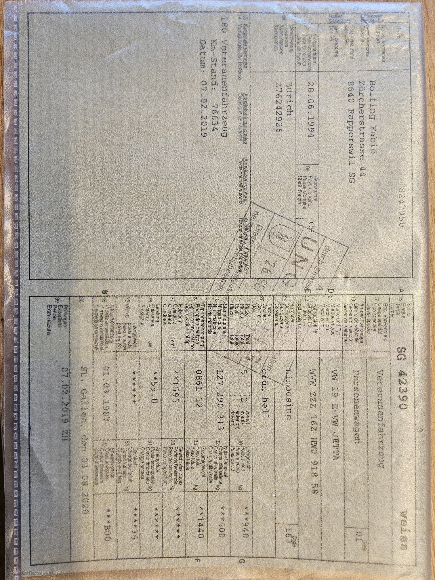 | Kommentar | Jetta mit Veteraneneintrag ab Platz Bremsen vorne ca. 20% (Sichtprüfung) Bremsen hinten ca. 20% (Sichtprüfung) Winterreifen ca. 3.0mm Fahrzeug hat Innen wie Aussen Gebrauchsspuren (siehe Bilder). Service uns Bremsen müssen gemacht werden. Am Fahrzeug wurde kein Werkstatttest gemacht. (Für sichtbare oder nicht sichtbare Mängel wird nicht gehaftet) Wir testen & kontrollieren nicht alle Funktionen des Fahrzeugs. Das Risiko liegt somit vollumfänglich beim Käufer. Ab Platz, ohne Garantie, Wandelung und Minderung werden wegbedungen. |