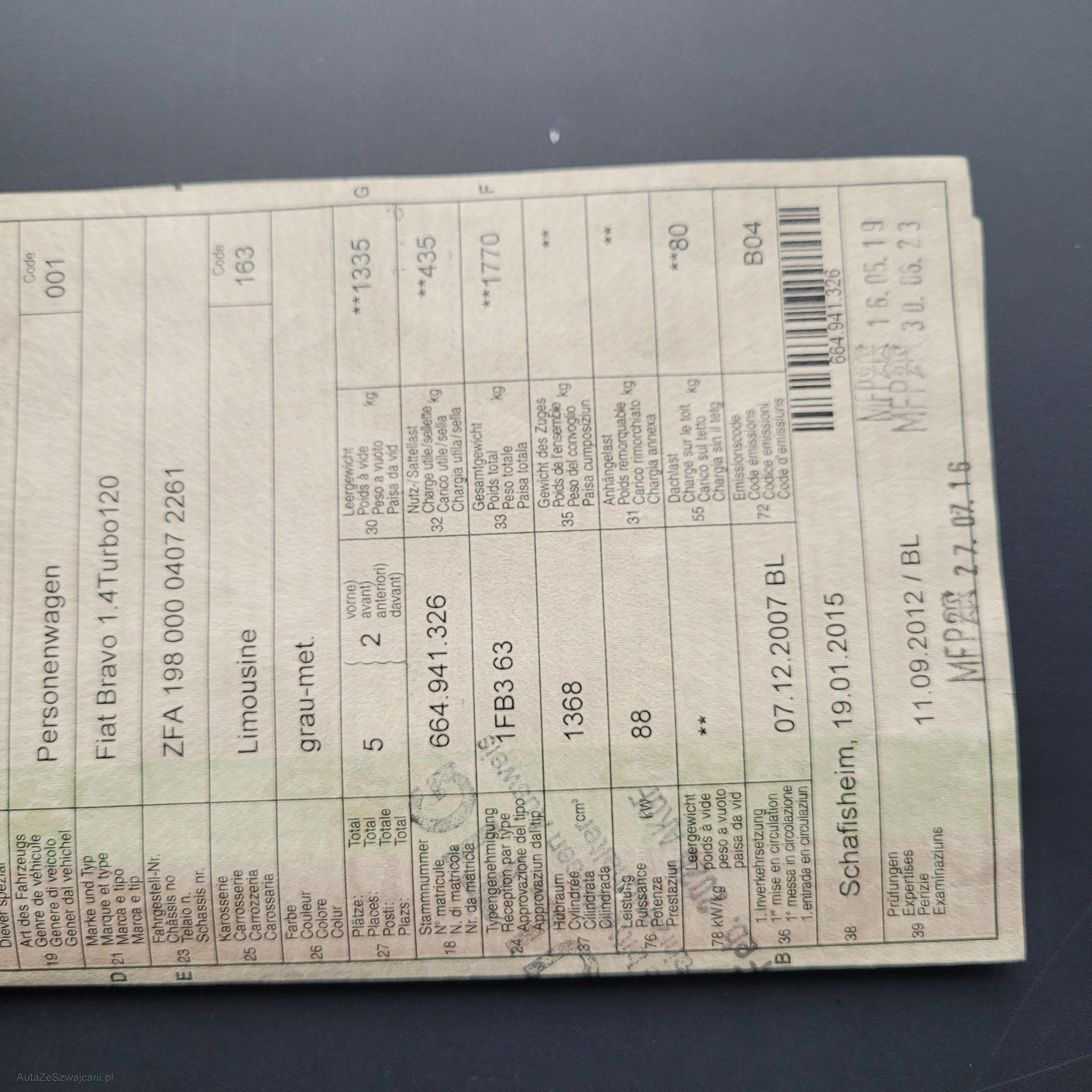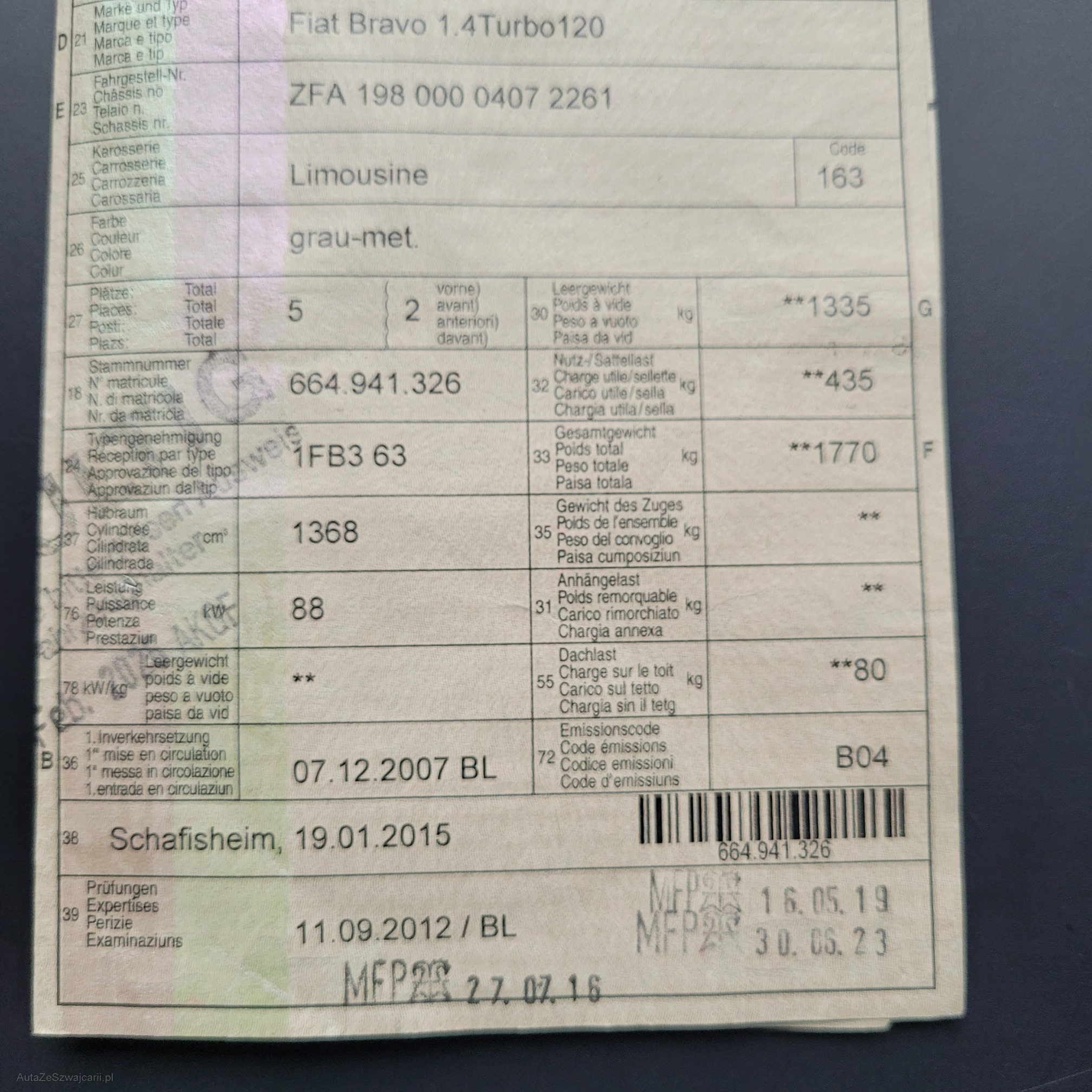 | Kommentar | Türe rechts keiner Lackschaden, Radlauf hinten inkl. Stossfänger rechts Lackschaden. Es wurde kein weiterer Werkstatttest durchgeführt. Jede Gewährleitung, soweit nach Gesetz möglich, wird wegbedungen. Insbesondere sind Wandelung und Minderung ausgeschlossen. |