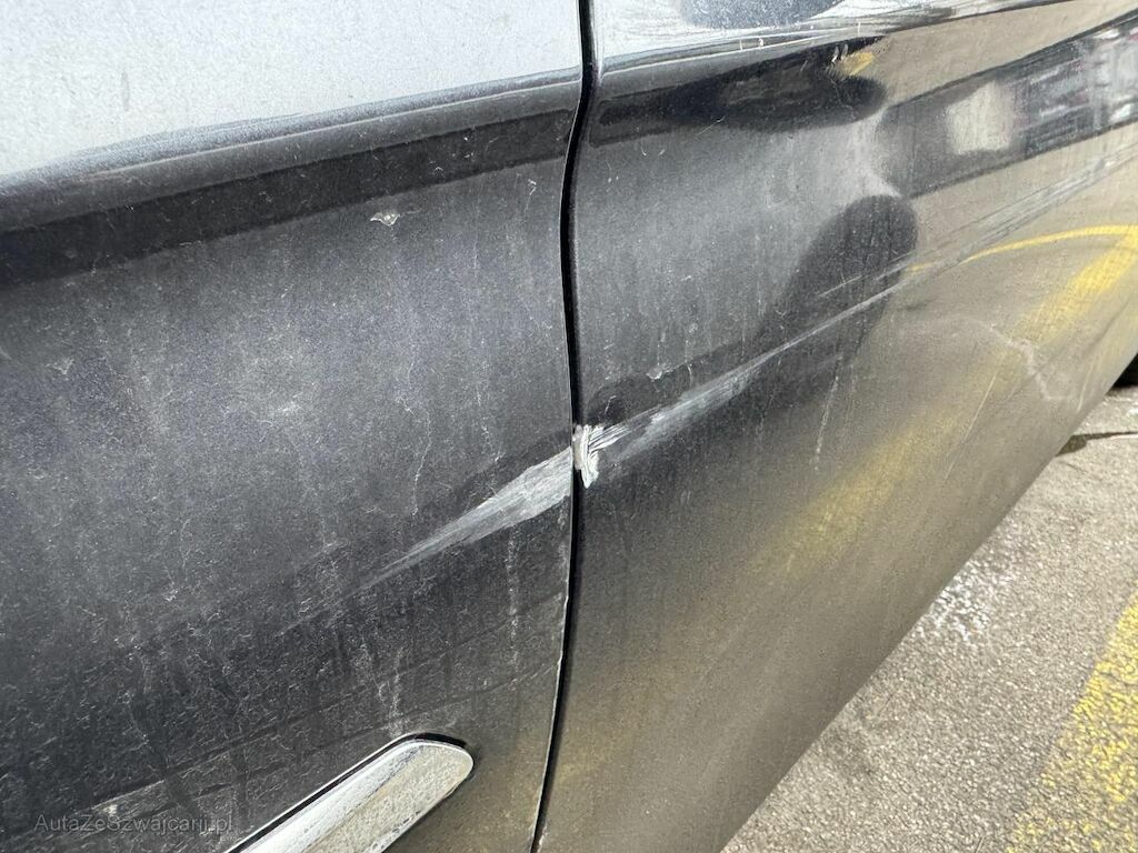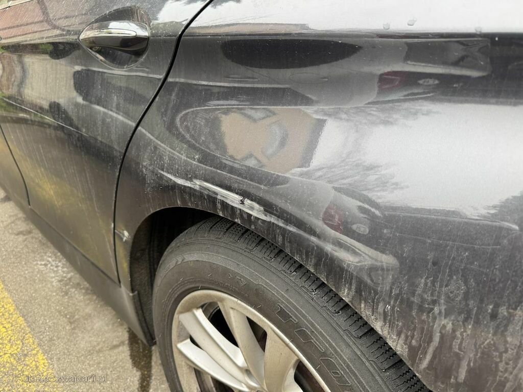 Kotflügel, beide Türen und Seitenwand deformiert. Stossstange vorne und Alufelge vorne links beschädigt.