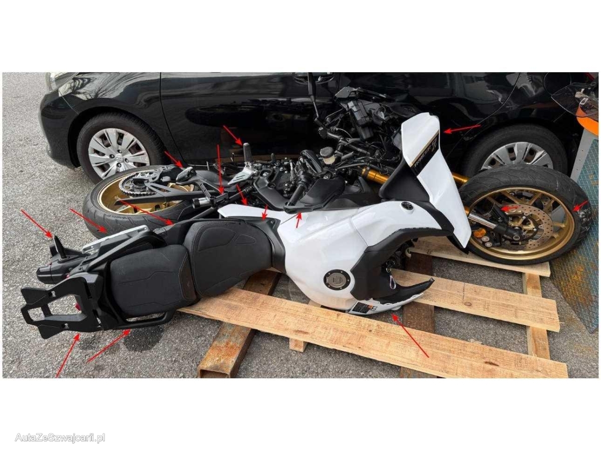 | Beschädigungen | Aussenspiegel rechts, Front, Fussraster rechts, Gabelholm, Griff rechts, Heckverkleidung, Lenker, Lenkschloss, Rad vorne, Rahmen, Rücklicht links, Scheinwerfer, Schutzblech vorne, Seite rechts, Sitz, Verschalungen rechts, Verschalungen vorne, Windschutzscheibe |