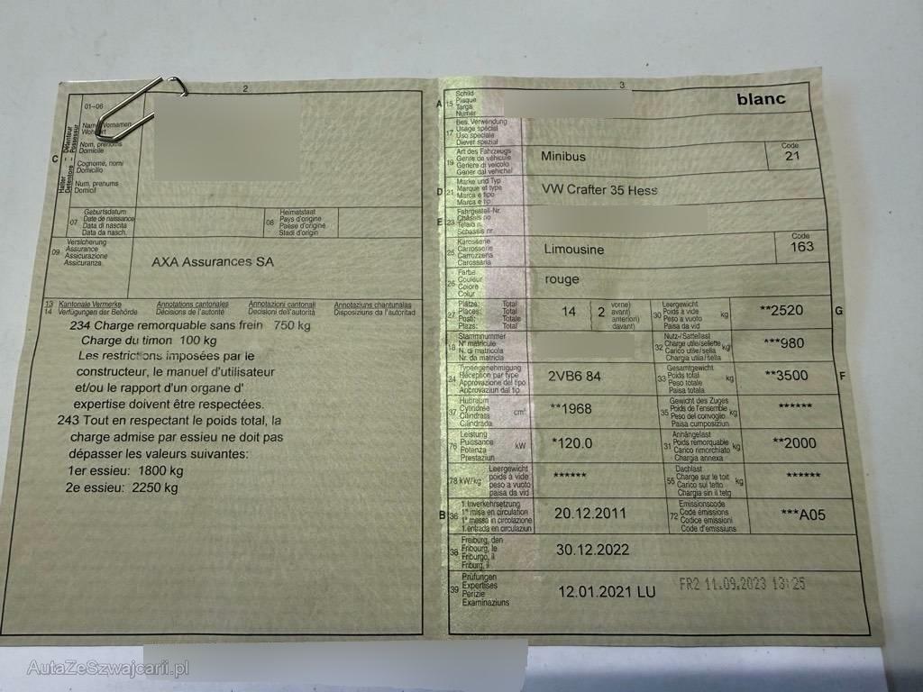 | Sonderausstattung | Fahrwerkspaket C (Stabilisator vorne verstärkt, Erhöhte Achslast vorn 1800 kg anstelle 1650 kg, Stabilisator hinten), Fenster vorne rechts fest, Abgedunkelte Seiten- und Heckscheibe, Fenster hinten links fest, Aussentemperaturanzeige, Dachverkleidung im Laderaum, Geschwindigkeitsbegrenzer 100 km/h, Anhängevorrichtung mit festmontiertem Kugelkopf, Verstärkte Heizung, Hochdach in Wagenfarbe, Airbag Fahrer und Beifahrer, Digitaler Tachograph, Ohne Laderaumtrennwand, Verkleidung des Laderaums bis Höhe Brüstungsgurt (Hartfaser) |