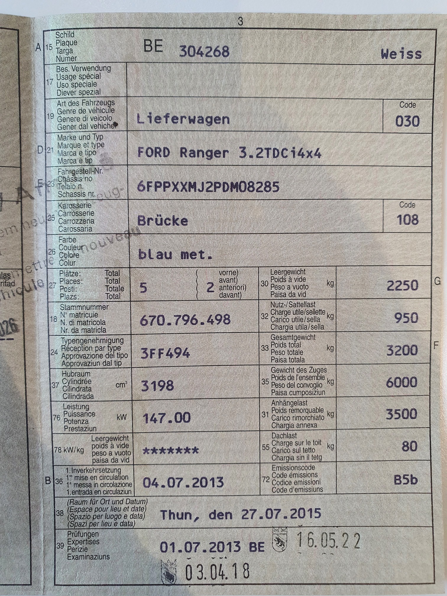 | Kommentar | Fzg. Hat Hagelschaden. Kein Werkstatttest durchgeführt. 2 Schlüssel vorhanden aber nur 1 funktioniert. Der Ranger fährt sich sehr gut. Keine warnlampe leuchtet. |