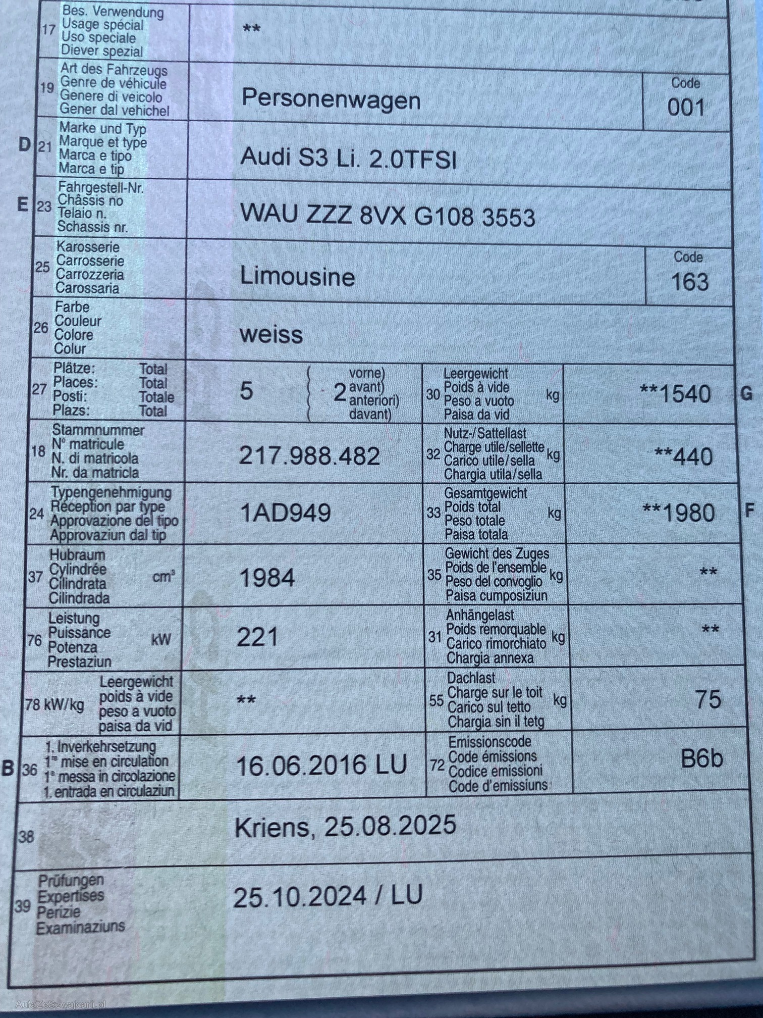 | Kommentar | AUDI S3 2.0 Sedan - HANDSCHALTER!! Fahrzeug ab Service 11.2025!! Kupplung kompl. erneuert 9.2024 vor ca. 9'900 km; Bremsen erneuert vor ca. 9'900 km; Hinterachs-Differential fachmännisch revidiert im Aug. 2025!! Belege vorhanden! Sommer u. Winterreifen auf Originalfelgen i.O.! Felgen teilweise etwas angefahren gem. Fotos! Zustand Carrosserie gem. Fotos! Leichte Lack-Abplatzer Stossstange hinten. Ersatz 2. Schlüssel kann evtl. über Versicherung abgewickelt werden. Fahrzeug ist Service gepflegt und in einem guten bis sehr guten Gesamtzustand! Innenraum in sehr gutem Zustand! VERKAUF IM KUNDENAUFTRAG! NUR SERIÖSE ANGEBOTE!! BARZAHLUNG bei Abholung! BESICHTIGUNG via möglich!! Verkauf ab Platz ohne Garantie und Nachwährschaft, sowie Wandelung und Minderung ausgeschlossen. Fahrzeug wurde nicht von uns mechanisch geprüft! Schäden und Zustand siehe Fotos. Es werden keine Nachverhandlungen geführt, auch für Schäden die nicht sichtbar sind oder nicht deklariert wurden. Fahrzeug kann besichtigt werden, somit liegt das Risiko vollumfänglich beim Käufer. Fahrzeugabholung innerhalb von drei Arbeitstagen nach Erhalt des Zuschlages! |