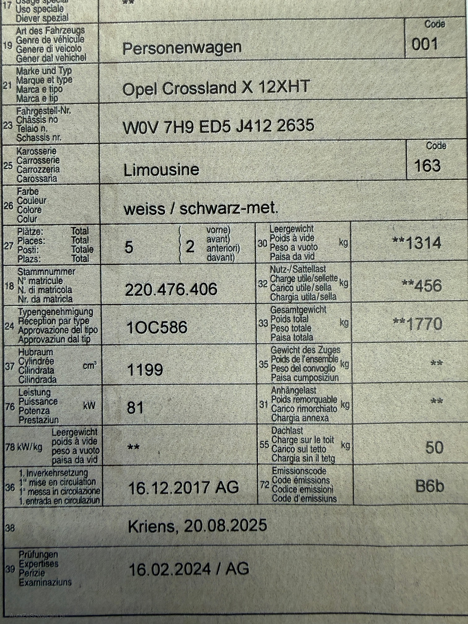 | Kommentar | Auspuff ist durchgerostet Bremsen sind vorne & hinten rostig Motor hat einen hohen Ölverbrauch laut Kunde Felgen sind nicht Original (ist nicht im Ausweis eingetragen) Beiblatt vorhanden.(siehe Foto) Zustand gem Fotos. Es wurden keine weiteren technische Prüfungen durchgeführt. |