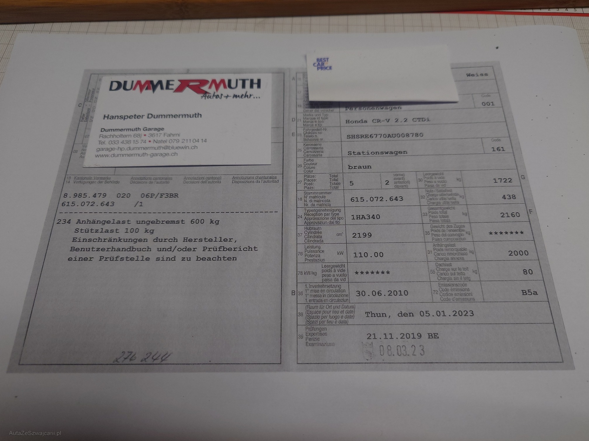 | Kommentar | Carrosserie diverse Schäden. Auspuffflansch Mitte verrostet. Traggelenk vorne links Spiel. Stabilisator vor und hinten Spiel. Bei Kilometer 210'262 wurden die Hochdruckpume, das Rail und die Injektoren ersetzt. Die Mängelliste ist nicht abschließend. Auto ab Platz ohne Garantie und Nachwährschaft. Keine Nachverhandlung! Bei Zuschlag muss das Auto innert 3Arbeitstagen abgeholt werden, sonst werden Parkgebühren von 30.- pro Tag verrechnet. |