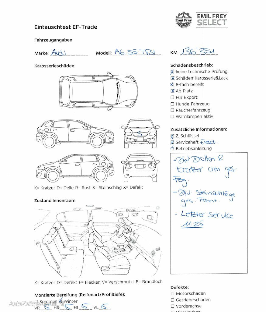 | Information | Keine Gewähr auf die Angaben der Sonder- und Serienausstattung / keine mechanische Prüfung. Fahrzeug wurde unzerlegt expertisiert / keine Haftung für allfällige, nach Demontage bekanntwerdenden Mängel. Fahrzeugbereifung und Ausstattung gemäss Fotos / Fahrzeugkauf auf eigenes Risiko ab Platz ohne Nachwährschaft. - Div. Dellen und Kratzer am gesamten Fahrzeug. - Div. Steinschläge an ges. Front. - Letzter Service 11.2025 |