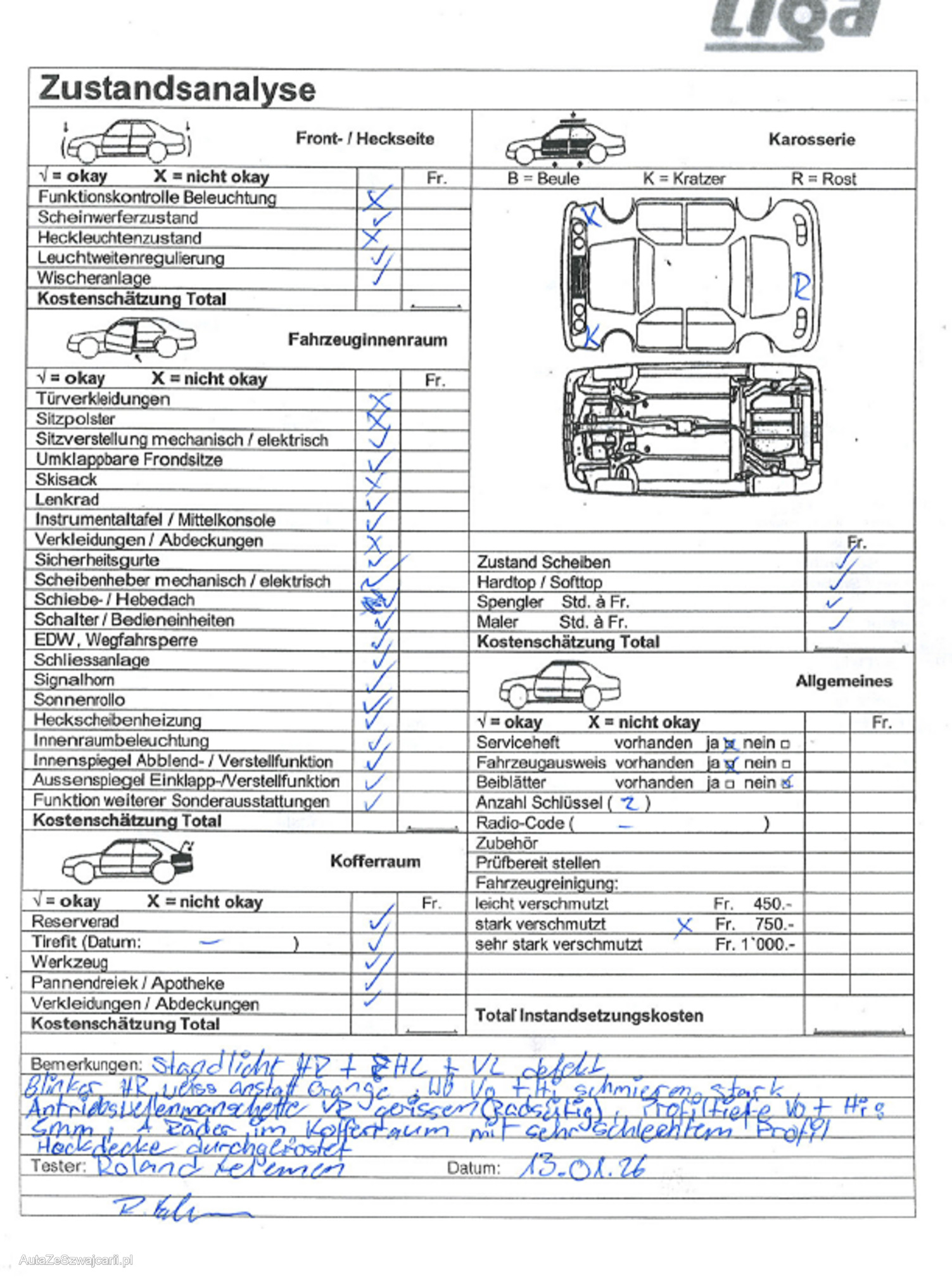 | Kommentar | Verkauf ausschliesslich ab Platz, Jede Gewährleistung, soweit nach Gesetz möglich, wird wegbedungen, insbesondere sind Wandelung und Minderung ausgeschlossen. Der technische Zustand ist unbekannt, das Fahrzeug wurde nicht geprüft. Zustand wie auf den Bildern, kann jedoch bei der Abholung abweichen. (z. B. Mängel, die uns nicht bekannt sind.) Sämtliche Mängel sind Sache des Käufers. Keine Rücknahme, keine Nachverhandlung, kein Preisnachlass. Kauf erfolgt wie gesehen. Booster mitnehmen > Fahrzeug muss man überbrücken |