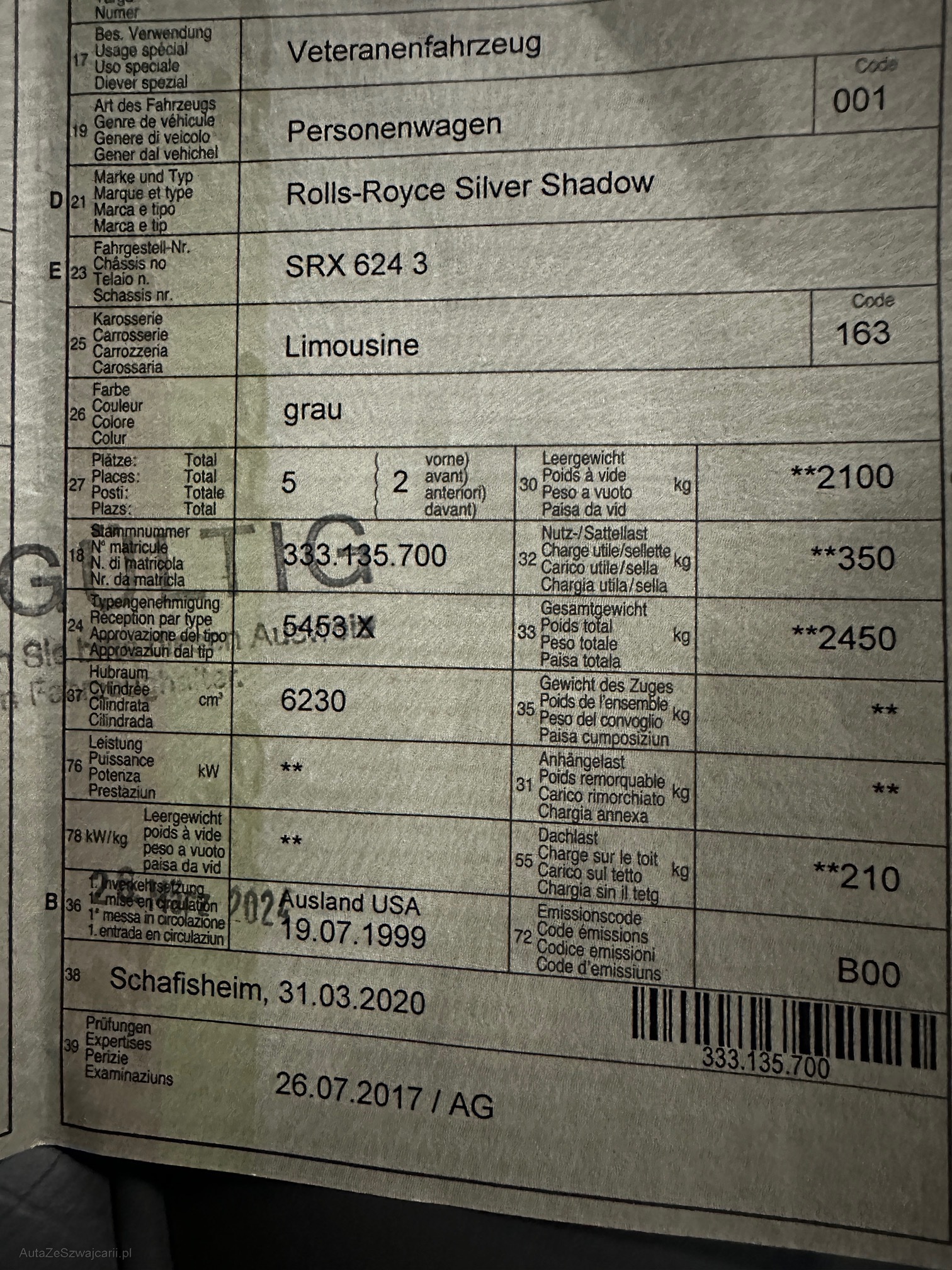 | Kommentar | sehr schöner Rolls Royce - läuft einwandfrei - 46000km es wurde kein Werkstattest gemacht - Mindestpreis 8000.- / Veteraneneintrag |