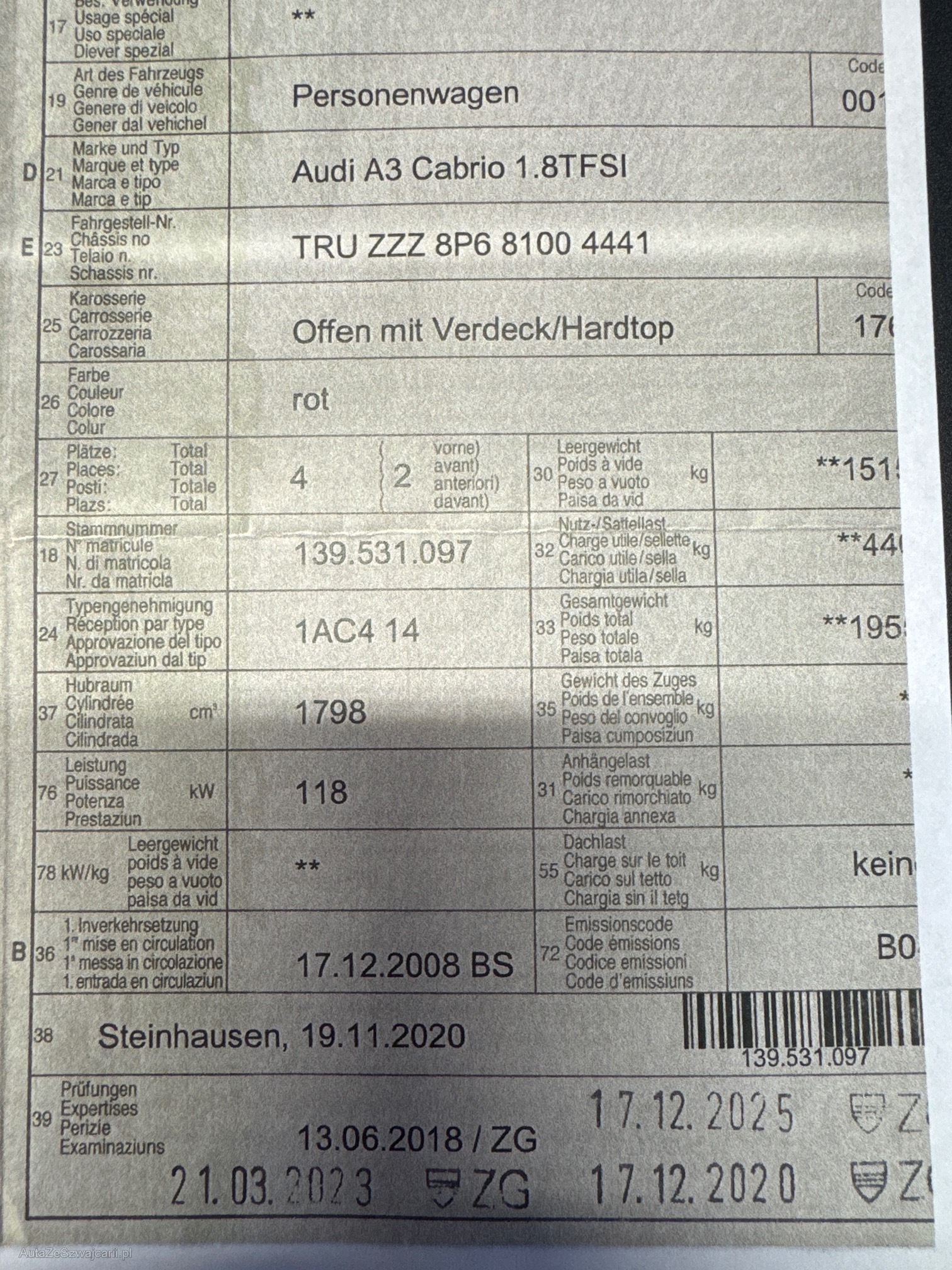 | Kommentar | Am Fahrzeug wurde kein Werkstatttest gemacht (Für sichtbare oder nicht sichtbare Mängel wird nicht gehaftet). Wir testen und kontrollieren nicht alle Funktionen vom Fahrzeug. Das Risiko liegt somit vollumfänglich beim Käufer. Nachdem der Höchstbietende den Zuschlag erhalten hat, gibt es keine Nachverhandlung, auch wenn nicht deklarierte Mängel zum Vorschein kommen sollten. Ab Platz ohne Garantie, Wandelung und Minderung werden wegbedungen. |