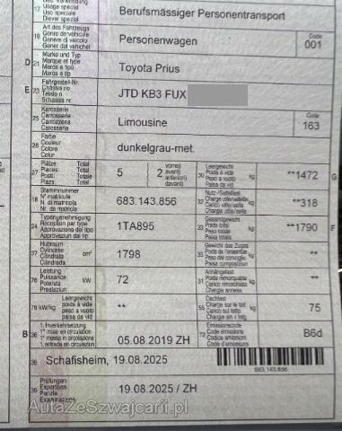 | Condition_and_Equipment | Demontage Persönliche Gegenstände oder Ladegut im Fahrzeug werden entfernt. Zustand Fahrzeug ist fahrbar. Bereifung Fahrzeug wird mit Winterräder abgegeben. Schlüssel Nur ein Schlüssel vorhanden. Weitere wichtige Hinweise Der Kilometerstand wurde abgelesen. Gebrauchsspuren und kleinere Vorschäden sind möglich. Am Fahrzeug sind Winterräder montiert, keine weitere Bereifung vorhanden. Vor Ort waren: 1 Schlüssel, Ausweis, Borddokumente. Motor und Getriebe wurde nicht geprüft Weitere nicht aufgeführte oder verdeckte Schäden sind möglich! Taxometer wird vor dem Verkauf ausgebaut. --- Front Front eingedrückt. Front links eingedrückt. Front rechts eingedrückt. Frontblech/Maskenblech eingedrückt. Radhaus vorne links eingedrückt / gestaucht. Fahrzeugvorbau verschoben. Motor Alle Kühler vorne sind eingedrückt. Achse Risiko Vorderachse. Elektrik Risiko Nebellampen. Innenraum Innenraum ungepflegt. Sonstige Schäden Lackierung matt (stumpf, beschädigt). --- Serienaustattung Airbag Fahrer und Beifahrerseite Elektrische Fensterheber vorne + hinten Nebelscheinwerfer Lederlenkrad Kopfairbag vorne und hinten Gepäckraumabdeckung Leichtmetallfelgen 15" Deaktivierung Beifahrerairbag Aussenspiegel elektrisch verstellbar/ heizbar und anklappbar Audiofernbedienung am Lenkrad Rücksitzbank geteilt abklappbar 60/40 Bodenteppiche Stabilitätskontrolle VSC + Traktionskontrolle TRC Zwei Zonen-Klimaautomatik Rückfahrkamera Seitenairbags vorne Adaptiver Tempomat ACC Frontsitze mit Schleudertrauma-Schutzsystem WIL Follow-me-home Lichtfunktion Knieairbag Fahrer Elektr. Lendenwirbelstütze Fahrersitz Fernlichtassistent Spurverlassenswarnung Smart entry-start/ Schliess- Startsystem Reifen-Reparatur Set LED-Scheinwerfer LED Tagfahrlicht ABS und EBD Elektr. Bremskraftverteilung inkl. BA Details siehe gültige Preisliste des Importeurs Keine Gewähr auf die Angaben der Serienausstattungen Verkehrsschild-Erkennungssystem Toyota Touch 2/ USB/ Bluetooth/ DAB+ Pre Collision System Gratis-Service 6 Jahre/ 60'000 km Sonderausstattung Metallic-Lackierung |
