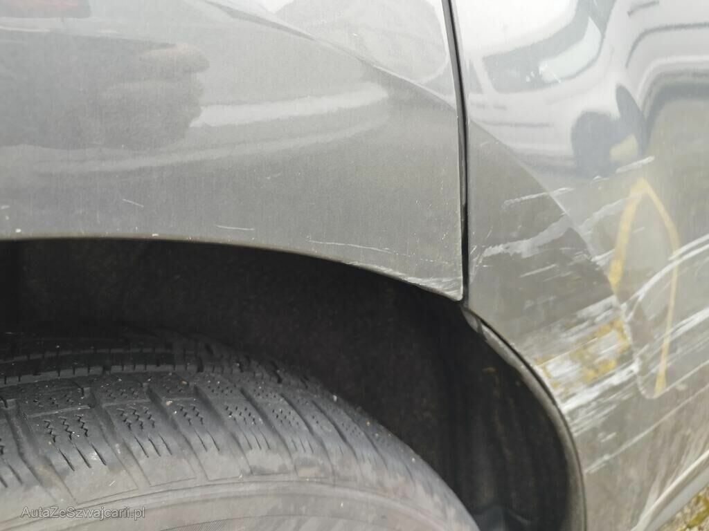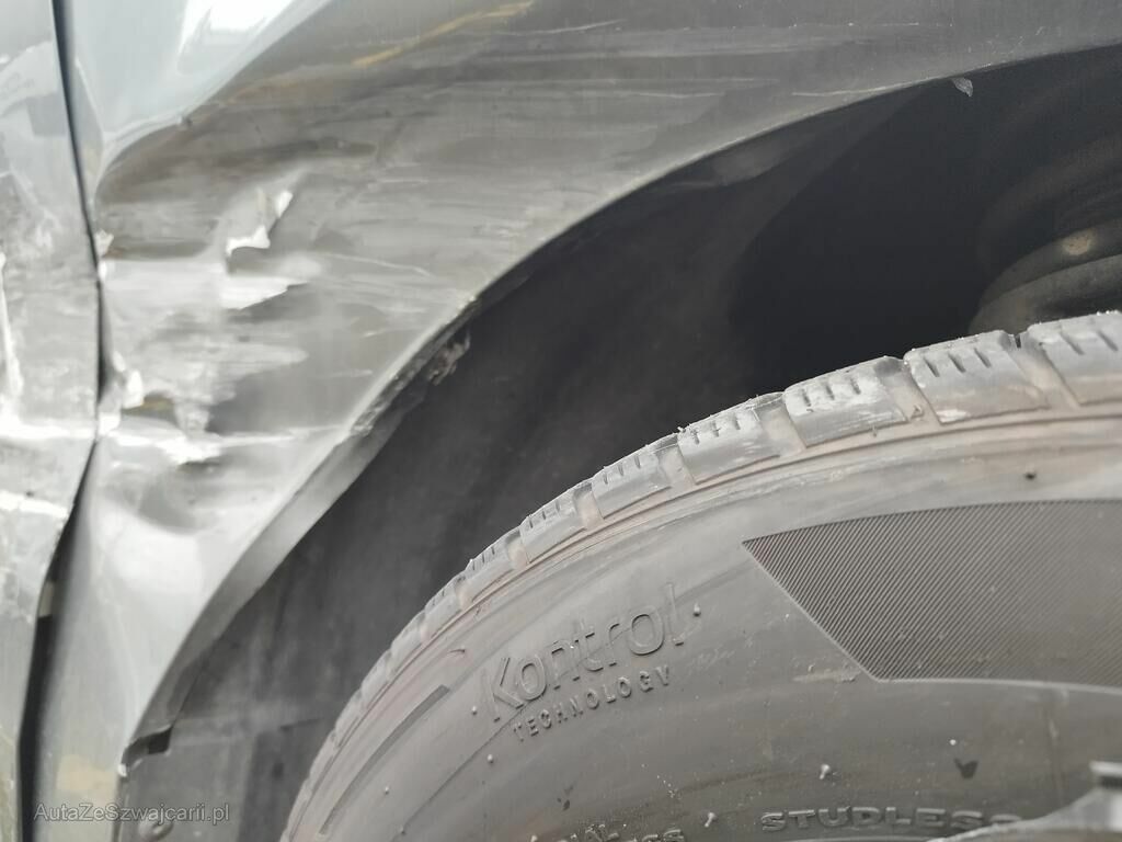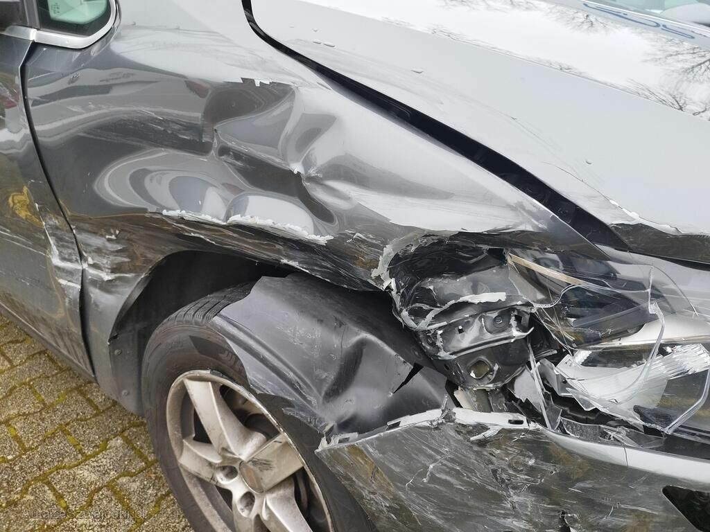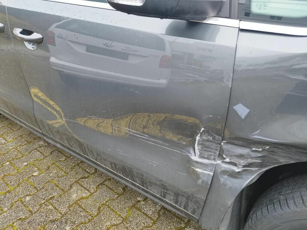 Die ganze rechte Seite hat Kratzspuren und ist deformiert, die Felge vorne rechts hat Kratzspuren, das Rad vorne rechts steht schräg, die Felge hinten rechts hat Kratzspuren.