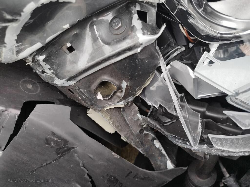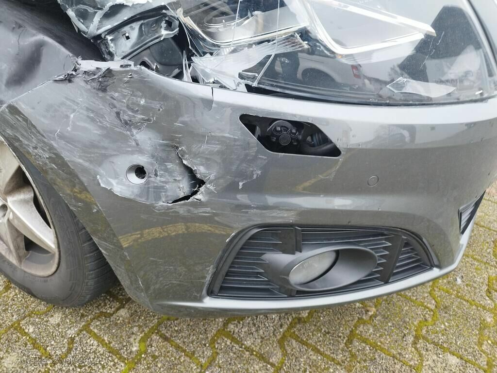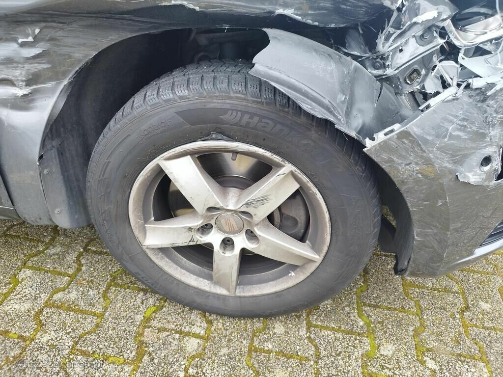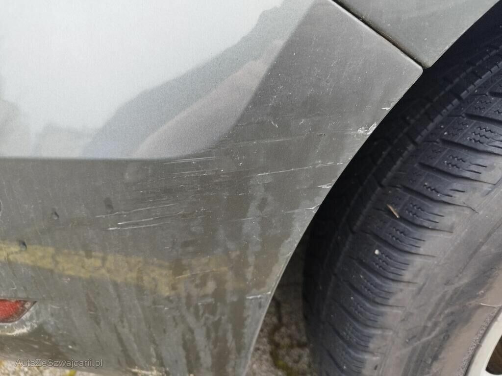 Die ganze rechte Seite hat Kratzspuren und ist deformiert, die Felge vorne rechts hat Kratzspuren, das Rad vorne rechts steht schräg, die Felge hinten rechts hat Kratzspuren.
