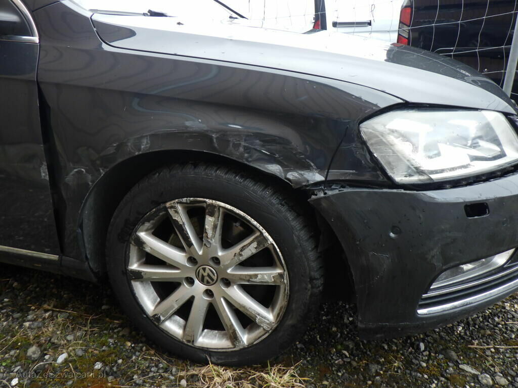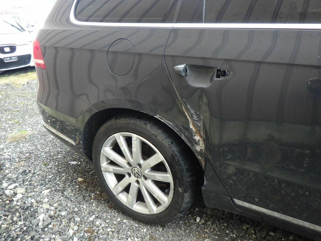 Choc avant et tout le flanc droit endommagé par un camion et la VW Passat a été poussée contre la bordure à gauche (pression sur les 2 jantes gauche + éventuellement suspensions gauche).