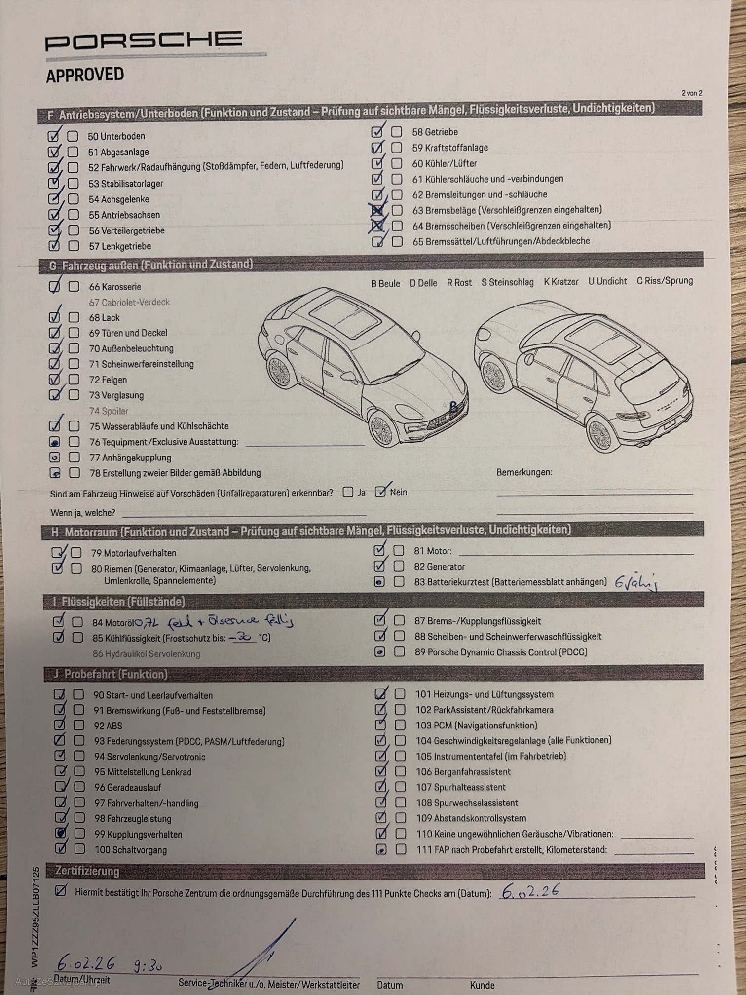 | Kommentar | - 111 Punkte Check bei Porsche am 06.02.2026 (siehe Fotos) - Ölservice fällig - Bremsen vorne zu ersetzen - Sonst keinerlei Mängel Am Fahrzeug wurde kein Werkstatttest gemacht (Für sichtbare oder nicht sichtbare Mängel wird nicht gehaftet). Wir testen & kontrollieren nicht alle Funktionen vom Fahrzeug. Das Risiko liegt somit vollumfänglich beim Käufer. Um Missverständnisse zu vermeiden kann das Fahrzeug auf Voranmeldung besichtigt & getestet werden, sollten Sie davon bewusst kein Gebrauch machen dann liegt die Verantwortung bei Ihnen. Nachdem der Höchstbietende den Zuschlag erhalten hat, gibt es keine Nachverhandlung, auch wenn nicht deklarierte Mängel zum Vorschein kommen sollten. Ab Platz ohne Garantie, Wandelung und Minderung werden weggebunden. |