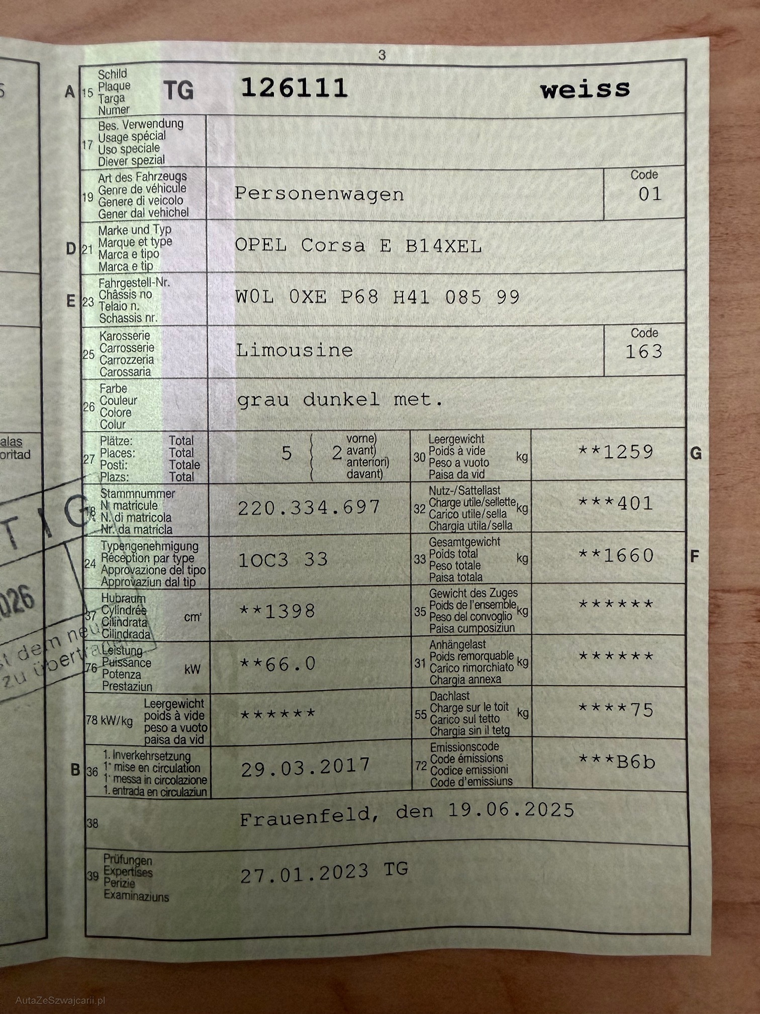| Kommentar | Servicegepflegtes Fahrzeug Gebrauchtes Fahrzeug kann diverse Kratzer und Beulen aufweisen. Fahrzeugbereifung und Ausstattung gemäss Foto. Keine mechanische Prüfung, Fahrzeugkauf auf eigenes Risiko ab Platz ohne Nachwährschaft. Die Gewährleistung für Sachmängel wird wegbedungen. Keine Barzahlung möglich, Sie erhalten von uns nach Zusage eine Rechnung, muss innert 3 Tagen bezahlt und abgeholt werden. |