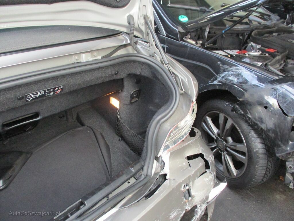 Starker Anstoss am Heck rechts; die Stossstange, die Heckkklappe und die rechts Seitenwand sind massiv gestaucht.