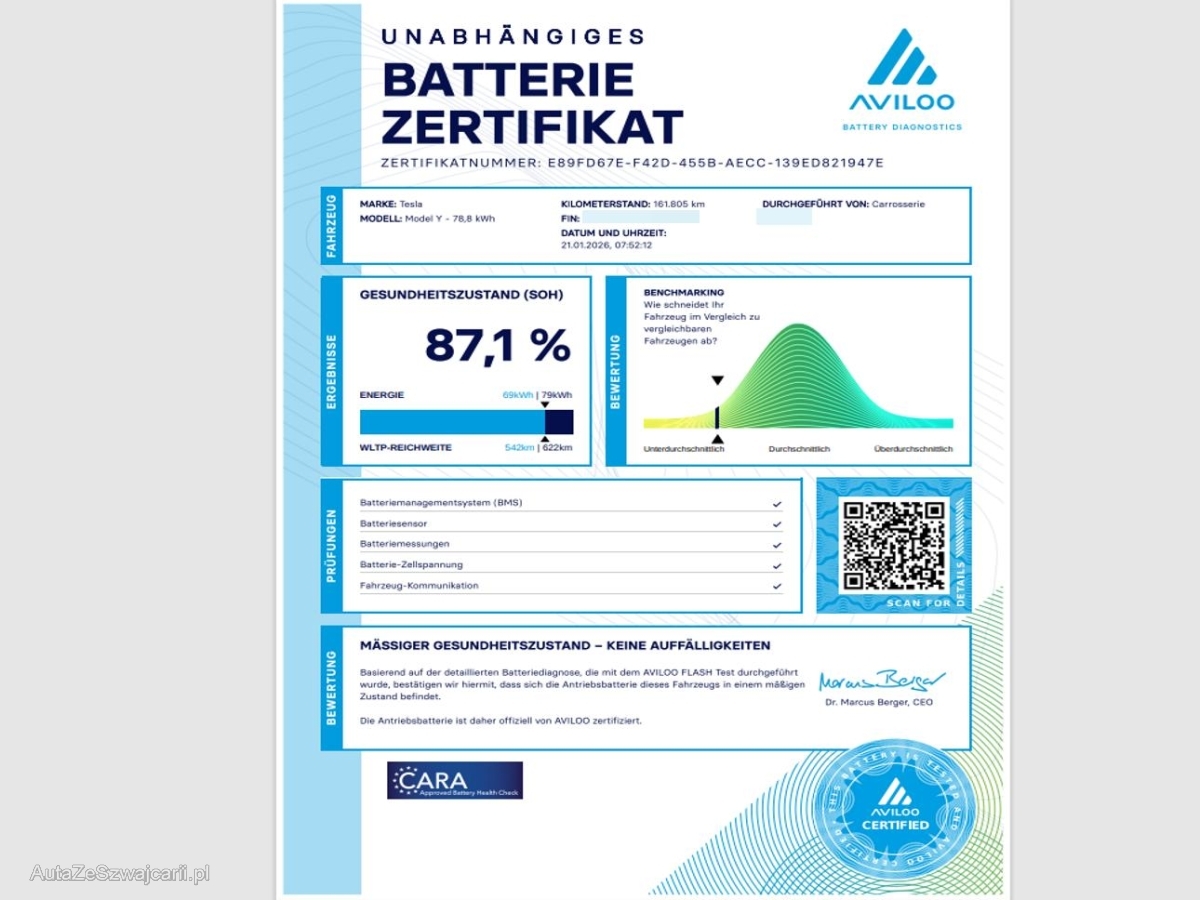 | Serienausstattung | Lenkrad: Lenkrad elektrisch längs- und höhen-verstellbar, Heckscheibenheizung, Supercharger Network Access + Pay-as-you-go, Zentralverriegelung mit Fernbedienung, Assist: Parkassistent, Licht: LED-Nebelscheinwerfer, Sitze: Ausführung 5 Sitzplätze, Lackierung: Pearl-Lackierung, Assist: Kollisionswarnung, Media: Premium-Audiosystem - 14 Lautsprecher - Subwoofer - 2 Verstärker und Klangfeldprozessor, Licht: Drittes Bremslicht LED, Mittelkonsole mit Ablagefach, Easy Entry - Sie können eine Easy Entry-Einstellung festlegen, die die Position des Lenkrads und des Fahrersitzes anpasst, um den Ein- und Ausstieg in bzw. aus Model Y zu erleichtern, Licht: Fernlichtautomatik, Scheibenwischer vorne mit Intervall, Keyless Entry, Seitenaufprall-Schutzsystem, Performance Upgrade, Media: Touchscreen, Assist: Rückfahrkamera, Sitze: Vordersitze elektrisch verstellbar 12-fach, Antiblockiersystem (ABS), Lenkrad: Lenkradheizung, Getriebe: Direktantrieb, Assist: Adaptive Cruise Control, Panorama-Glasdach, Assist: ABS und TCS, Aussenspiegel automatisch abblendend, Bordcomputer, 12-Volt-Steckdose vorne, Kabinenkamera, Sitze: Fünfsitzer-Innenraum, Klima: Klimatisierungsautomatik, Getönte Scheiben, Elektrische Fensterheber vorne, Licht: Nebelschlussleuchte, Assist: Spurhalteassistent, Airbag: Seiten- und Kopfairbags, Sitze: Rücksitzlehne geteilt abklappbar, Polster: Kunstleder-Polsterung, Sicherheitsgurtsystem, Servolenkung, Dekor: Black PUR Interior, Media: Bluetooth Freisprecheinrichtung, Media: USB-A Anschluss im Handschuhfach mit abnehmbaren 128 GB Speichermedium, Räder: Leichtmetallfelgen 19J mit Pneu, Licht: LED-Tagfahrlicht, Assist: Lenkassistent - Mit den neuen Tesla Vision-Kameras, Sensoren und der erhöhten Rechenleistung kann Ihr Tesla nun über komplexere Strassenführungen navigieren., Räder: 19" Gemini Wheels, Assist: Basic Autopilot, Licht: LED Scheinwerfer, Gurtstraffer vorne, Sitze: Rücksitze heizbar, Sitze: Vordersitze heizbar, Reifendruck-Kontrollanzeige, Innenraumbeleuchtung - Deckenleuchten - Ambientebeleuchtung - Leseleuchten - Lenkradbeleuchtung, Media: Media Player - Radio - Bluetooth - Streamen - Spotify - Caraoke - TuneIn - Tidal, Fußgängerwarnsystem, Reifenreparatur-Set (Tire Fit), Aussenspiegel rechts und links beheizt, elektrisch verstell- / und einklappbar, Airbag: Airbag Beifahrer deaktivierbar, Assist: Frontaufprallwarnung, Media: Navigationssystem mit Onboard-Karten, Assist: Park Distance Control (PDC), Airbag: Airbag Fahrer und Beifahrer, Media: Wi-Fi Hotspot, Lenkrad: Multifunktionslenkrad, Wegfahrsperre elektronisch, Sitze: Kopfstützen verstellbar, Elektronisches Stabilitäts-Programm (ESP), Garantie: 8 Jahre oder 192'000 km auf Elektroantriebssystem und Batterie (ab 1. Inv.), Garantie: 4 Jahre oder 80'000 km, Assist: Notbremsassistent, ISOFIX Kindersitzvorrichtung |
