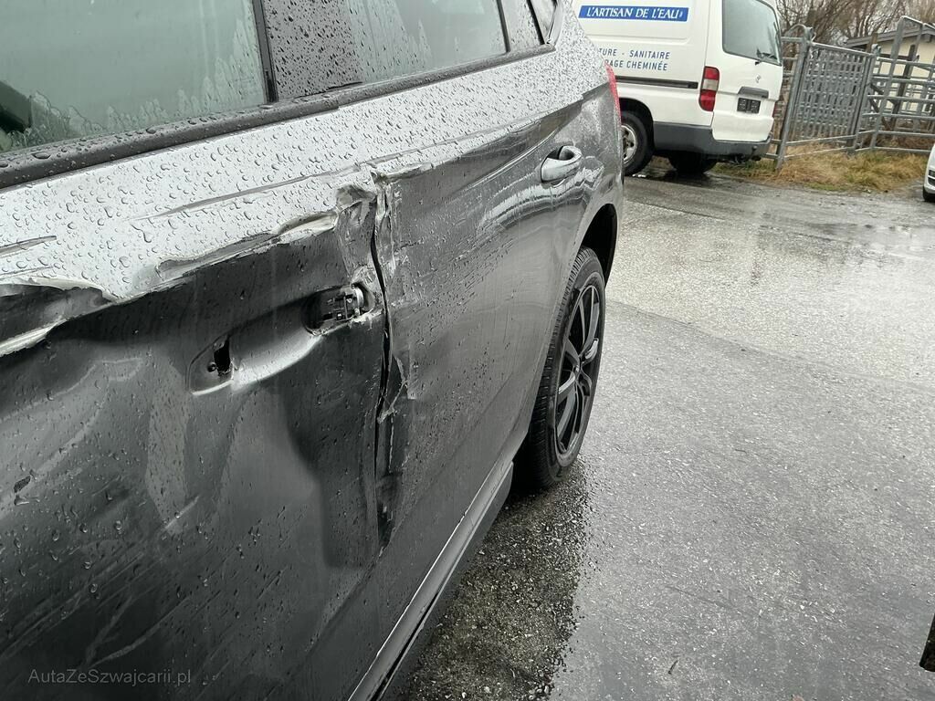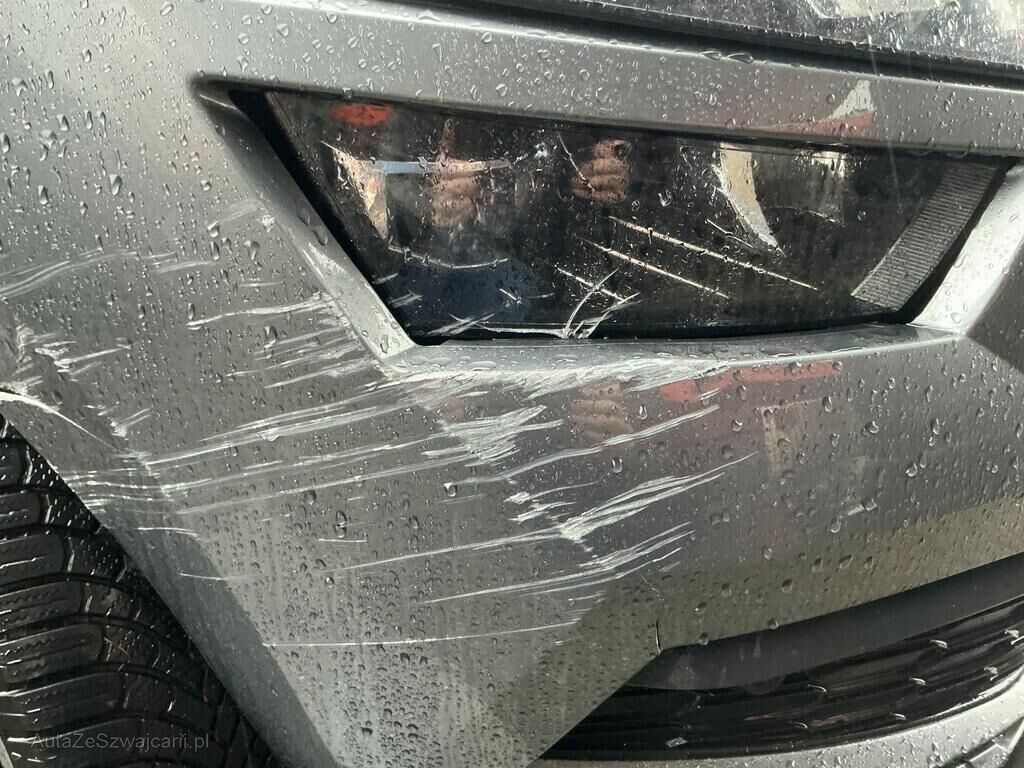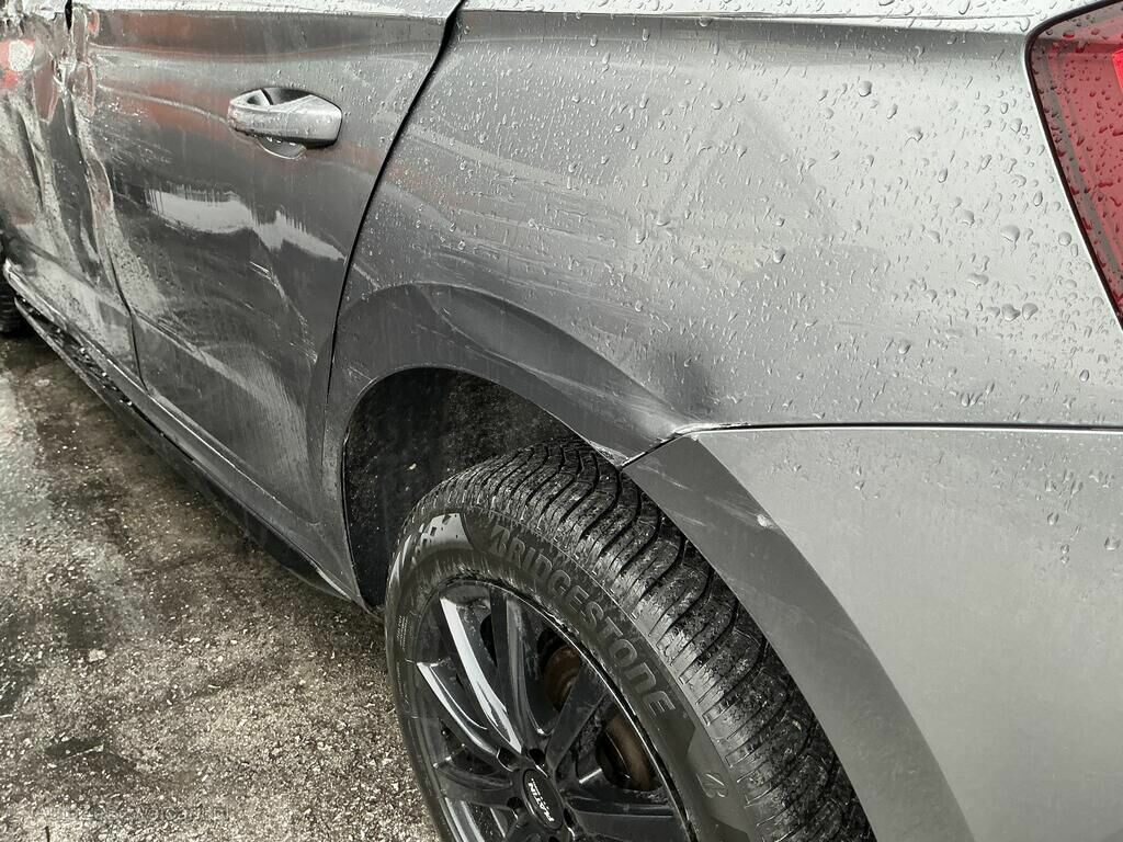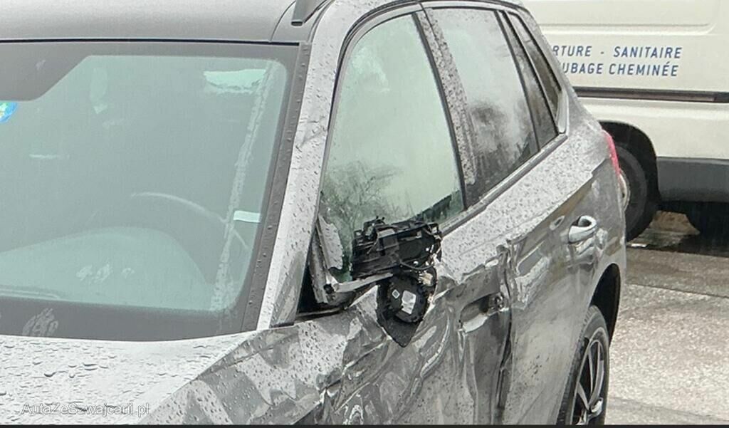 Jante avant droite cassée, pneu percé et suspension faussée, phares avant gauche et droit, pare-chocs avant, rétroviseur gauche, cache bas de caisse gauche, poignée de porte avant gauche cassés. Capot, ailes avant et arrière gauche, porte avant et arrière gauche, montant de pare-brise gauche et bas de caisse gauche enfoncés. Divers témoins allumés.