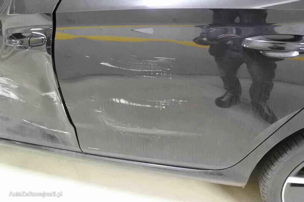 Der Kotflügel mit Auskleidung, die Felge sowie die Radaufhängung und beide Türen mit Anbauteilen sind beschädigt. Die B-Seule und der Schweller links sind deformiert.