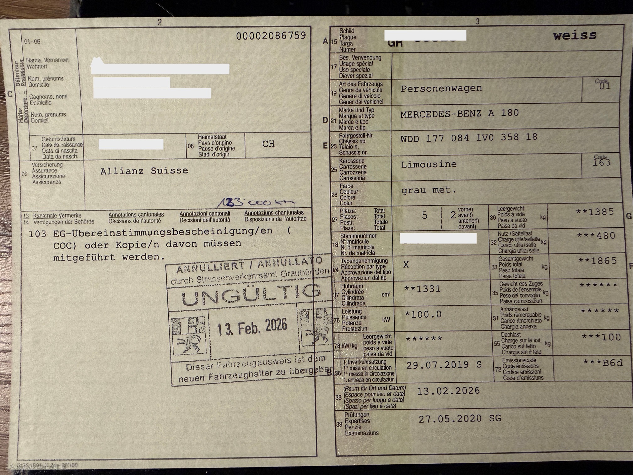 | Kommentar | Fahrzeug ist mechanisch einwandfrei fahrbar, es leuchten keine Warnlampen oder sonstiges. Service fällig Fahrzeug ist bereits eingetauscht und wird nur abgegeben werden wenn wir einen Mindestreis von Fr. 10`000.- und mehr erzielen. Fahrzeug muss innert 3 Arbeitstagen Abgeholt werden. |