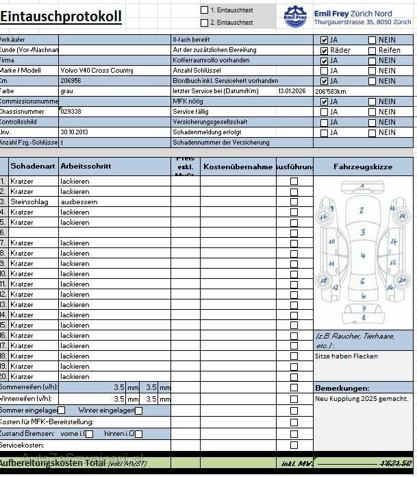 | Information | Keine Gewähr auf die Angaben der Sonder- und Serienausstattung / keine mechanische Prüfung. Fahrzeug wurde unzerlegt expertisiert / keine Haftung für allfällige, nach Demontage bekanntwerdenden Mängel. Fahrzeugbereifung und Ausstattung gemäss Fotos / Fahrzeugkauf auf eigenes Risiko ab Platz ohne Nachwährschaft. - Diverse Kratzer und Dellen am gesamten Fahrzeug - Div. Kratzer und Flecken im Innenraum. - Div. kleine Steinschläge an der Frontscheibe. - Aussen überall Beulen und Kratzer - Letzter Service 13.01.2026 bei 206'000km - Kupplung ersetzt im 2025 |