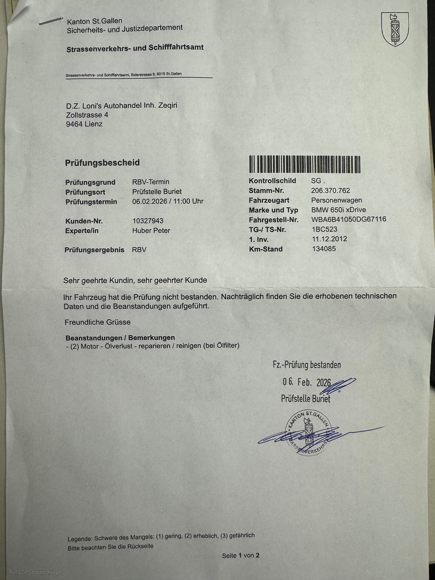 | Kommentar | Wir bieten einen wunderschönen BMW 650i xDrive Gran Coupe. Es wurde gerade ein grosser Service gemacht und die MFK ist frisch diesen Monat. Felgen sind teilweise angefahren. Beiger Innenraum Teppich an gewissen Stellen dreckig. Der rechte Vorderreifen verliert Luft. Technisch ist er in sehr gutem Zustand da alles frisch gemacht wurde. Nur Winterbereifung am Auto. Felgen und Distanzscheiben sind eingetragen und eine Eignungserklärung ist vorhanden. Der Verkauf erfolgt ab Platz, ohne Garantie, ohne Nachwährschaft und ohne Gewährleistung, gekauft wie gesehen. Eine umfassende Prüfung oder Funktionskontrolle der Fahrzeuge findet nicht statt. Für sichtbare sowie nicht sichtbare Mängel wird keinerlei Haftung übernommen. Eine Besichtigung vor der Auktion ist nach Voranmeldung möglich und wird empfohlen. Mit dem Zuschlag gilt der Kauf als endgültig abgeschlossen. Nachverhandlungen, Rücktritt, Wandelung oder Minderung sowie jegliche Ansprüche aufgrund nicht deklarierter Mängel sind ausgeschlossen, soweit gesetzlich zulässig. |