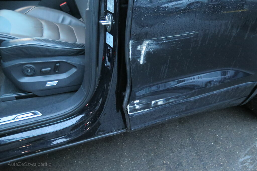 Flanc gauche rayé et enfoncé, pied milieu refoulé, pare-chocs arrière rayé, jante alu avant endommagée, train avant faussé, jante alu arrière rayée.