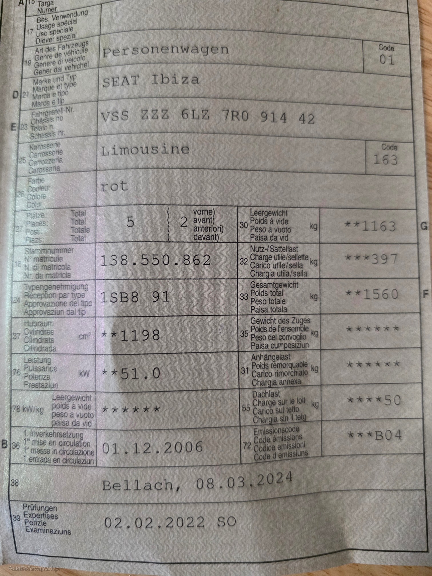 | Kommentar | Rost Kotflügel Hagelschaden Auspuff undicht Keine Probefahrt gemacht Kein Werkstattcheck |