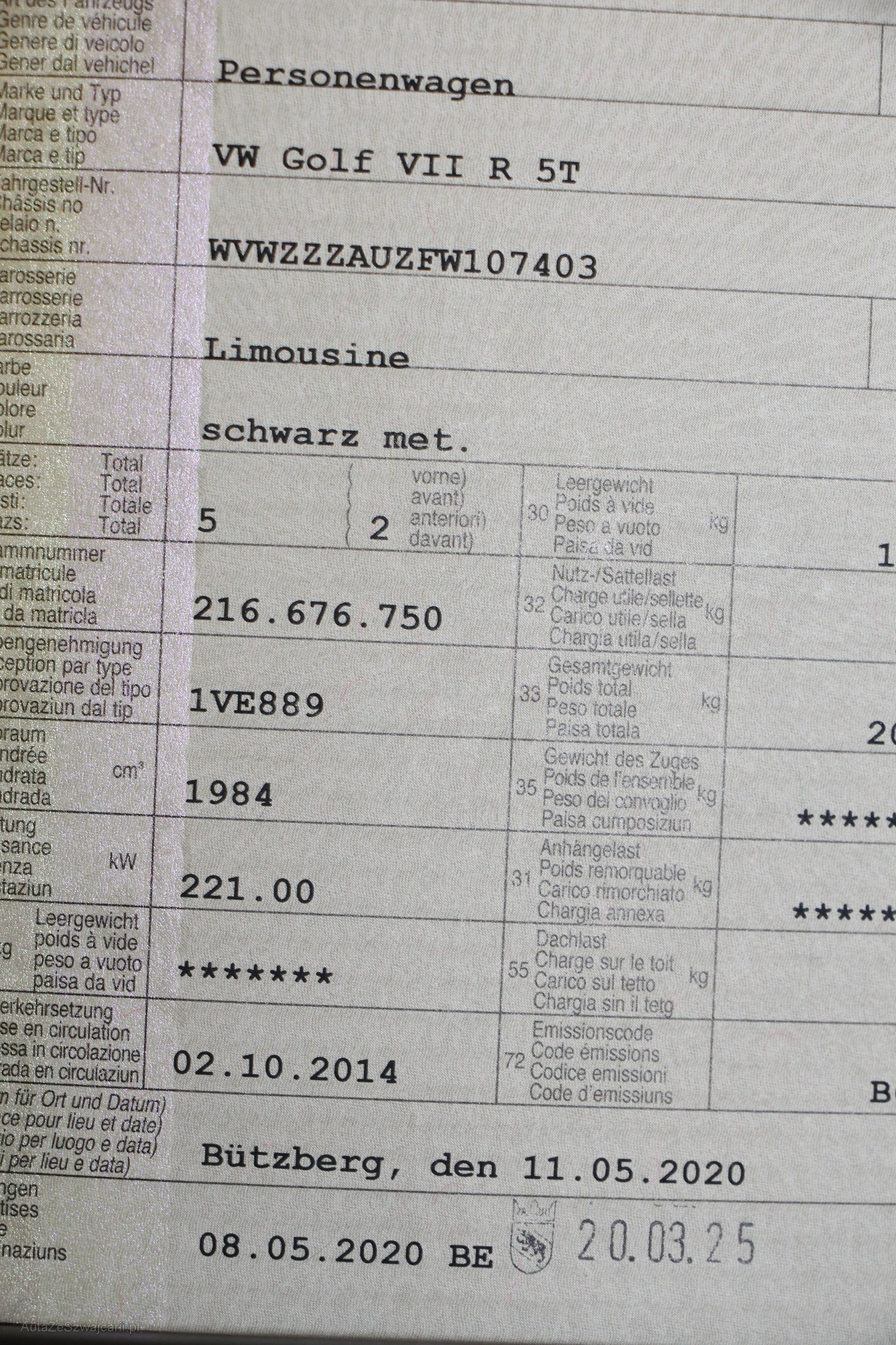 | Kommentar | VW Golf VII R 5T DSG - Klima - Zentralverriegelung - Elektrische Fenster - R Ausführung - Navigation - Sitzheizung - Alufelgen - 8 Pneu ( Sommerpneu nicht gesehen ) - 5 Türig - DSG - Service gepflegt immer VW Garage !! - CH-Fahrzeug - Bremsen hinten vor der MFK 3.2025 NEU gemacht - Info : Das Fahrzeug hatte vor 2 Monate ein leichter Seitenschaden links wurde aber alles von der Versicherung bezahlt und repariert ! Letzte MFK : 20.3.2025 !! Letzter Service : 15.6.2024 / 180883 Km !! Mängel : Lautsprecher hinten links & rechts gehen nicht !! Lautsprecher vorne rechts geht zwischendurch nicht !! Motorlampe brennt ab und zu , aber problemlos fahrbar !! Diverse Gebrauchspuren aussen und innen ( Waschkratzer , 1 Kleine Beule auf der Haube von einem Ast ) !! 3x Felgen Kratzer !! Weitere Mängel sind nicht ausgeschlossen, Fahrzeug wurde von uns nicht angeschaut !! kein Werkstatttest !! Am Fahrzeug wurde keine Prüfung der mechanischen Teile und der Carrosserie durchgeführt! Das Risiko liegt somit vollumfänglich beim Käufer. Nach Zuschlag keine Nachverhandlungen möglich. Kein Rückgaberecht !! |