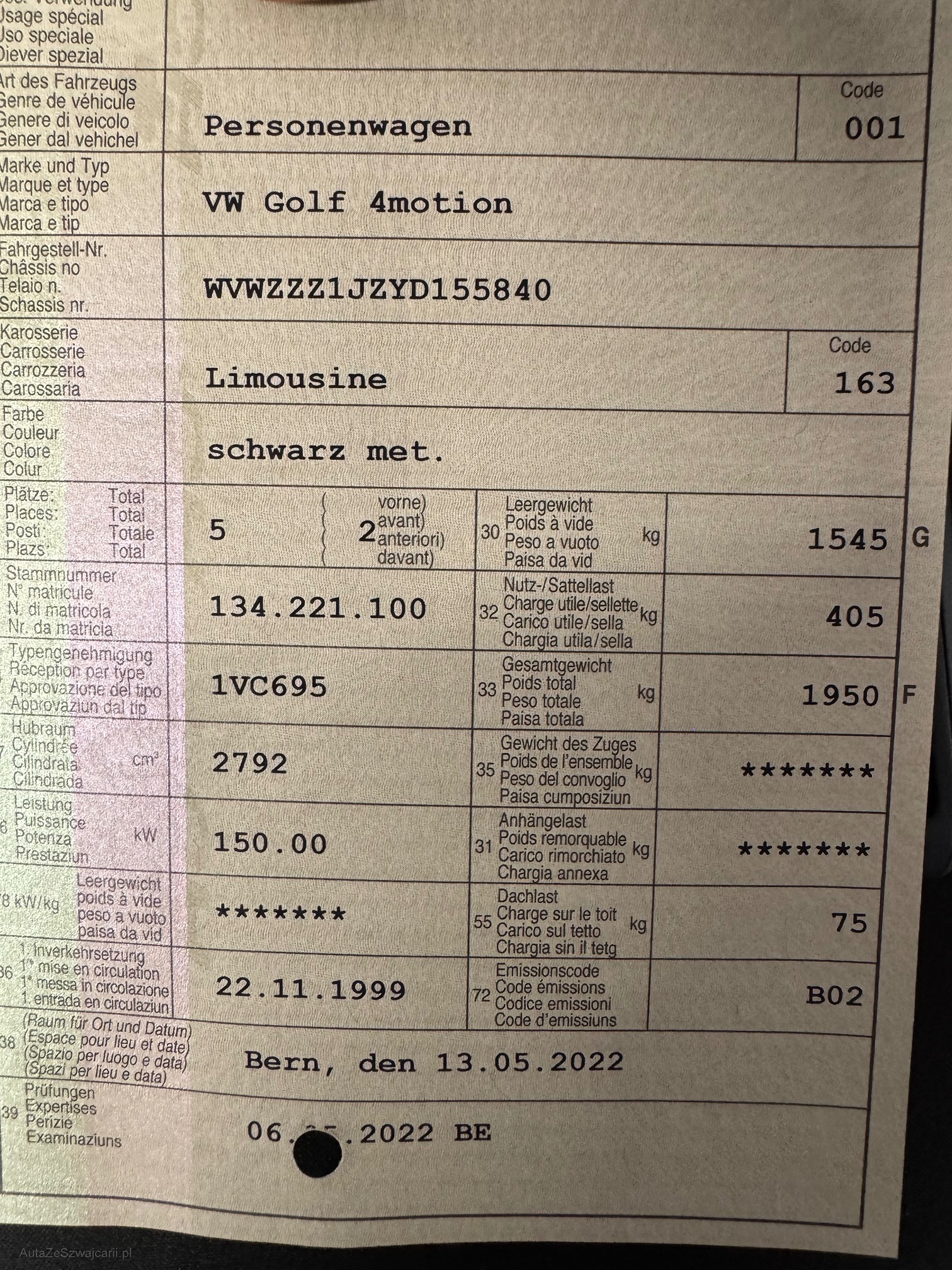 | Kommentar | Vw Golf VR6 4x4 Fahrzeug läuft gut. Airbaglampe leuchtet. Diverse Carrosserieschäden und Rost (siehe Foto) kein Rostloch aber fängt an. Es wurde kein Werkstattest durchgeführt. Ab Platz ohne Garantie Muss innert 5 Arbeitstagen abgeholt werden. Sonst 40.-/weiteren Tag |
