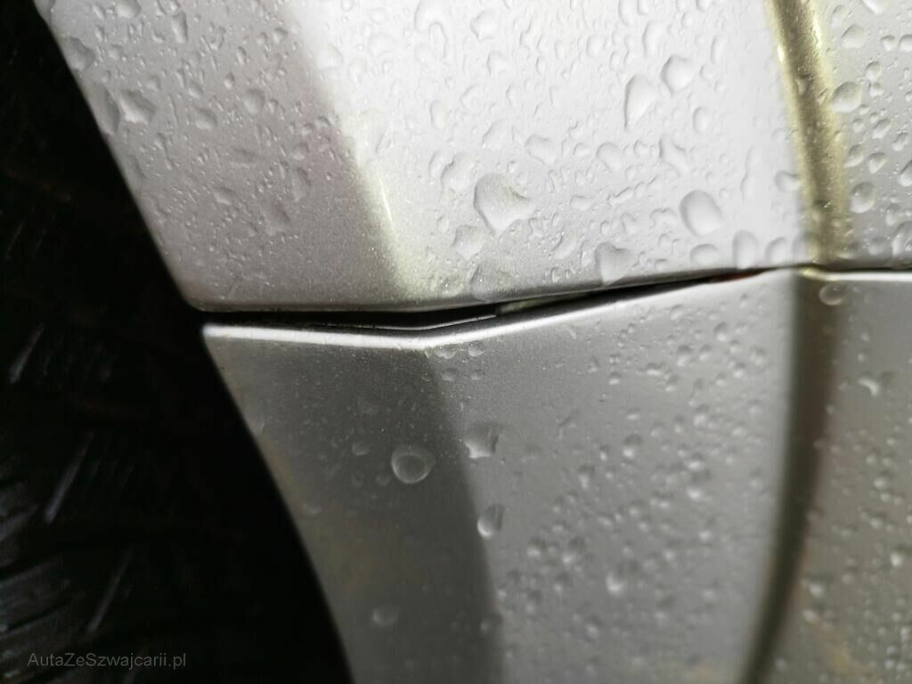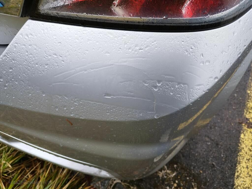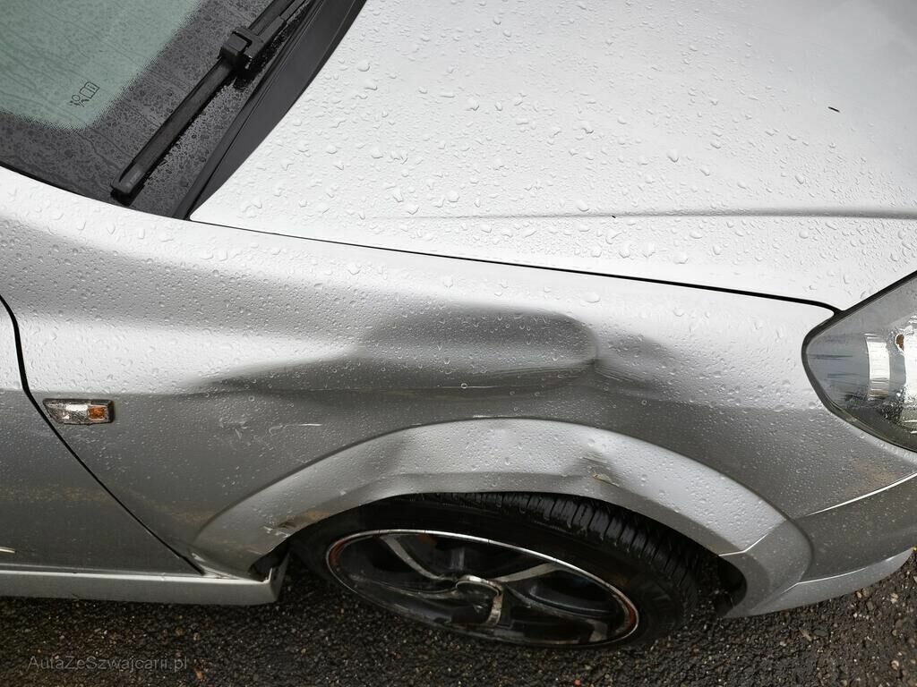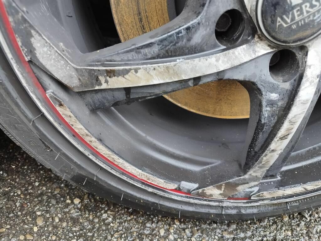 Die Stossstange vorne rechts ist gerissen, der Kotflügel vorne rechts ist deformiert, die Türe vorne rechts hat eine Delle und Kratzspuren, die Schwellerverkleidung rechts hat Kratzspuren, die Felge vorne rechts hat Kratzspuren, das Rad vorne rechts steht schräg.
