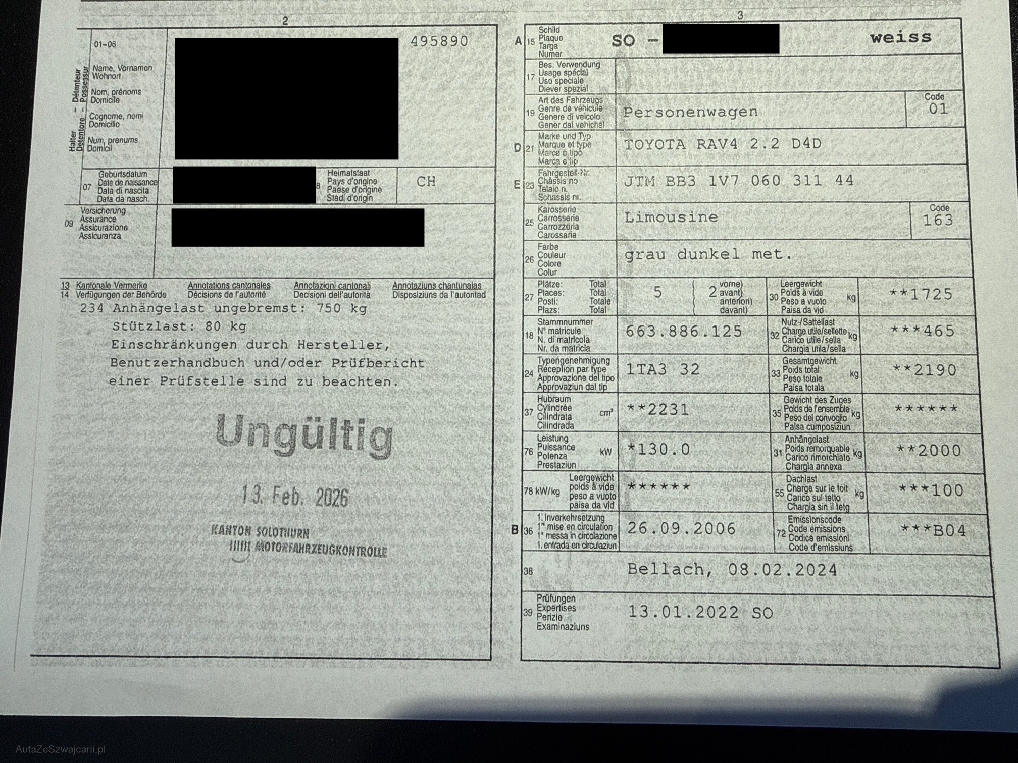 | Kommentar | Fahrzeug hat im Mai 2012 mit 140‘889 km einen neuen Motor erhalten! ab Platz und ohne Garantie! Fahrzeug kann mit Voranmeldung besichtigt werden. |