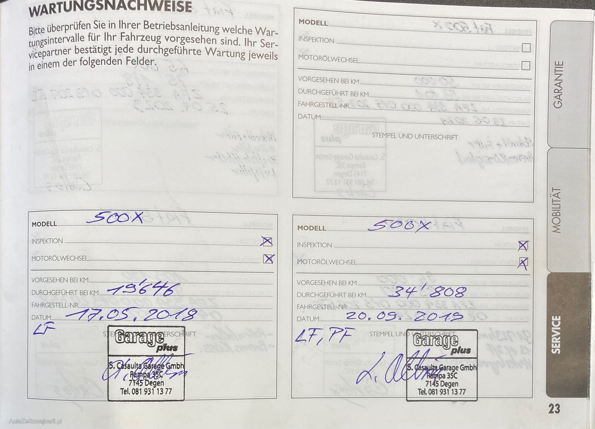 | Kommentar | Fahrzeug aus 1. Hand 8-fach Räder, Sommerreifen zu ersetzen und Winterreifen für den Verkauf auch zu ersetzen (Empfehlung) Letzter Service bei 93`000 Km / 02.2026, Empfehlung einen Service durchzuführen Gemäss Serviceheft wurde der Zahnrimen noch nie ersetzt, unsere Empfehlung nach 10 Jahre zu ersetzten. Fahrzeug hat rundherum kleine Schäden an der Carrosserie, kleine Krätze, kleine Dellen/Beulen usw. mit wenig Aufwand könnten diese ausgebessert werden. Im Fahrzeug wurde nicht geraucht, auch kein Hundehalter. Wir finden es riecht trotzdem leicht nach Hunde, Hundehaare sind keine zu finden?!?! MFK Prüfung wurde am 16.02.2026 durchgeführt und der Partikelfilter wurde gemessen ohne Beanstandung. Frontscheibe hat einen Steinschlag der repariert wurde, keine Beanstandung von der MFK. Wir haben nach unserem bessten Wissen und Gewissen das Fahrzeug inseriert und fotografiert. Weitere kleiner beanstandungen sind nicht auszuschliessen! |