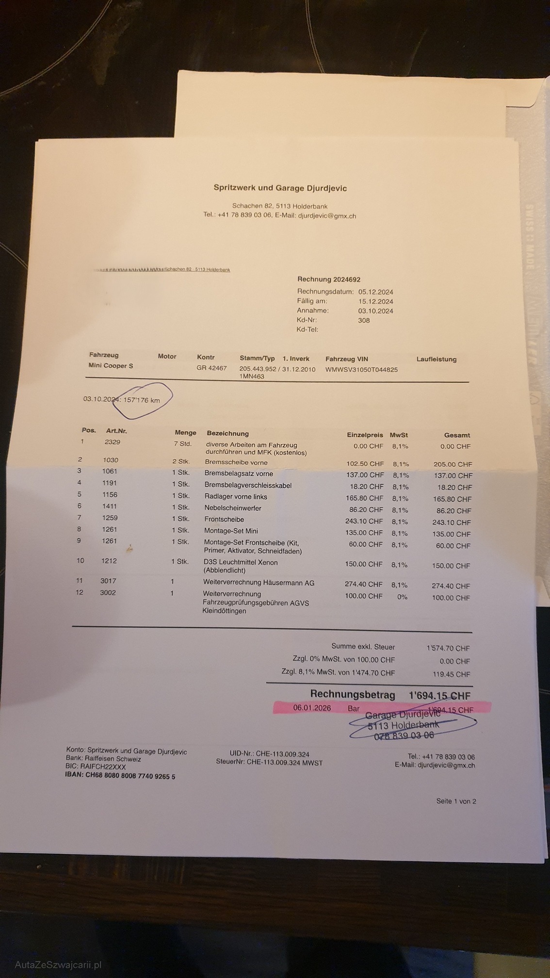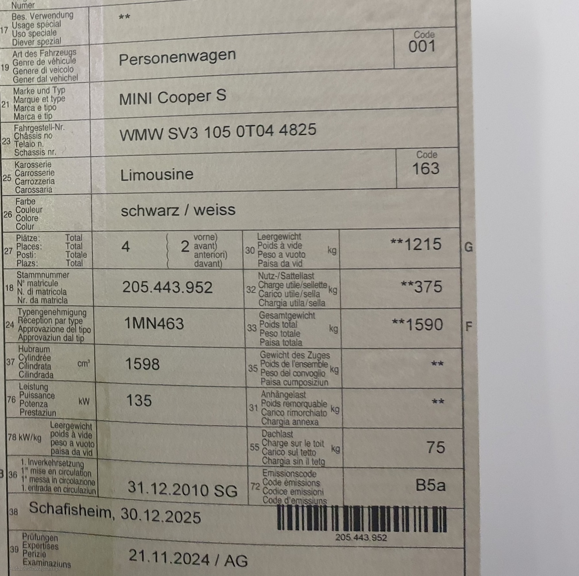 | Kommentar | Bilder vom Kunden gemacht _ Am Fahrzeug wurde kein Werkstatttest gemacht (Für sichtbare oder nicht sichtbare Mängel wird nicht gehaftet). Wir testen & kontrollieren nicht alle Funktionen vom Fahrzeug. Das Risiko liegt somit vollumfänglich beim Käufer. Nachdem der Höchstbietende den Zuschlag erhalten hat, gibt es keine Nachverhandlung, auch wenn nicht deklarierte Mängel zum Vorschein kommen sollten. Ab Platz ohne Garantie, die Gewährleistung ist vollständig ausgeschlossen, damit insbesondere auch Wandelung und Minderung. _ Sonderausstattung gemäss Eurotax ohne Gewähr _ Aussenspiegelpaket Sonderausstattung 360.00 Aussenspiegel rechts und links elektrisch verstell- und beheizbar und Scheibenwaschdüsen beheizbar Sonderausstattung 90.00 Veloursfussmatten vorne und hinten Sonderausstattung 120.00 Verbandskasten Sonderausstattung 90.00 Innenspiegel automatisch abblendbar Sonderausstattung 220.00 Aschenbecher und Zigarettenanzünder Sonderausstattung 50.00 Sitze: Vordersitze höhenverstellbar Sonderausstattung 0.00 Mittelarmlehne vorne Sonderausstattung 240.00 Ablagenpaket Sonderausstattung 0.00 Dekor: Interieuroberflächen Piano Black Sonderausstattung 130.00 Colour Line Carbon Black Sonderausstattung 190.00 Sport Button Sonderausstattung 190.00 Licht: Nebelscheinwerfer Sonderausstattung 0.00 Scheibenwischer vorne mit Regensensor und automatischem Einschalten der Abblendlichter Sonderausstattung 180.00 Xenon-Scheinwerfer inkl. Hochdruck- Scheinwerferwaschanlage und Leuchtweitenregulierung Sonderausstattung 0.00 Klima: Klimatisierungsautomatik Sonderausstattung 0.00 Bordcomputer Sonderausstattung 0.00 Paket: Lichtpaket Sonderausstattung 0.00 Dynamische Traktionskontrolle (DTC) Sonderausstattung 240.00 Radio MINI Boost Sonderausstattung 310.00 Freisprecheinrichtung Bluetooth mit USB-Anschluss Sonderausstattung 620.00 Weisse Blinkleuchten Sonderausstattung 120.00 Paket Chili Sonderausstattung 3’690.00 Metallic-Lackierung Sonderausstattung 660.00 |
