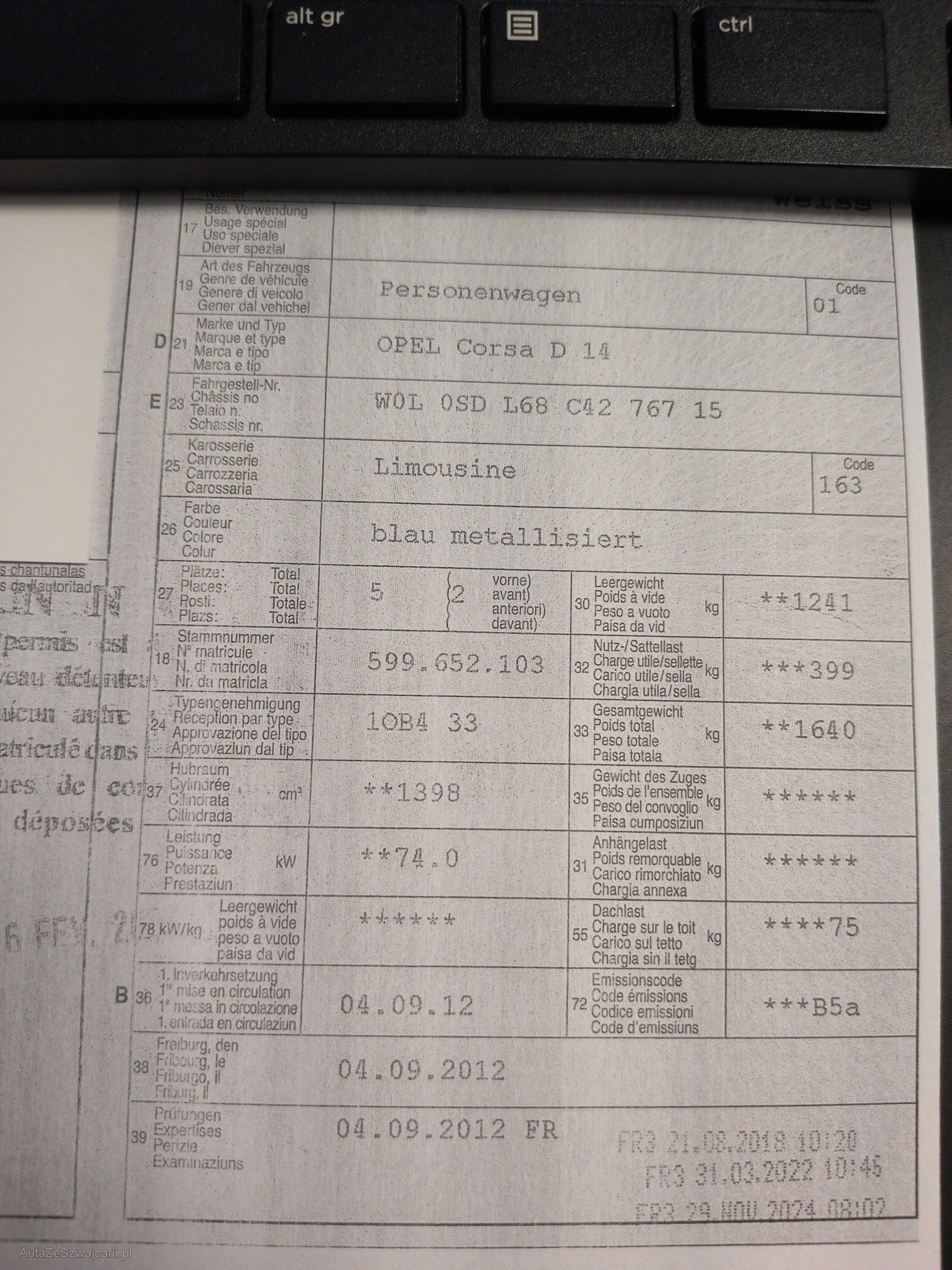 | Kommentar | Hutablage fehlt, Servicehaft und Betriebsanleitung fehlen. Türgriff innen Türe vorne rechts geklebt. Service fällig, Zahnriemen wohl auch. Nur Winterreifen ca.4,5 bis 5,5mm. Aufzählung der Mängel ist nicht abschliessend. Wir testen & kontrollieren nicht alle Funktionen vom Fahrzeug. Das Risiko liegt somit vollumfänglich beim Käufer. Nachdem der Höchstbietende den Zuschlag erhalten hat, gibt es keine Nachverhandlung, auch wenn nicht deklarierte Mängel zum Vorschein kommen sollten. Ab Platz ohne Garantie, Wandelung und Minderung werden wegbedungen. Abholung nach Zuschlag zeitnah. |