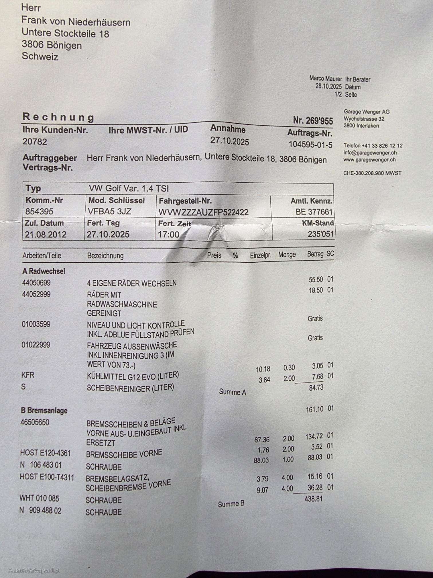 | Kommentar | Bei einem 20-minütigen Check wurden keine Mängel festgestellt. Das Fahrzeug fährt sich sehr schön und hat einen sehr geringen Verbrauch. Die Bremsen wurden vor Kurzem ersetzt. Optisch: Vorne haben die Sitze leichte Wasserflecken. Ansonsten ist das Fahrzeug innen wie aussen sauber und gepflegt. Verkauf ab Platz, Barzahlung. Das Fahrzeug ist innert 5 Tagen abzuholen. |