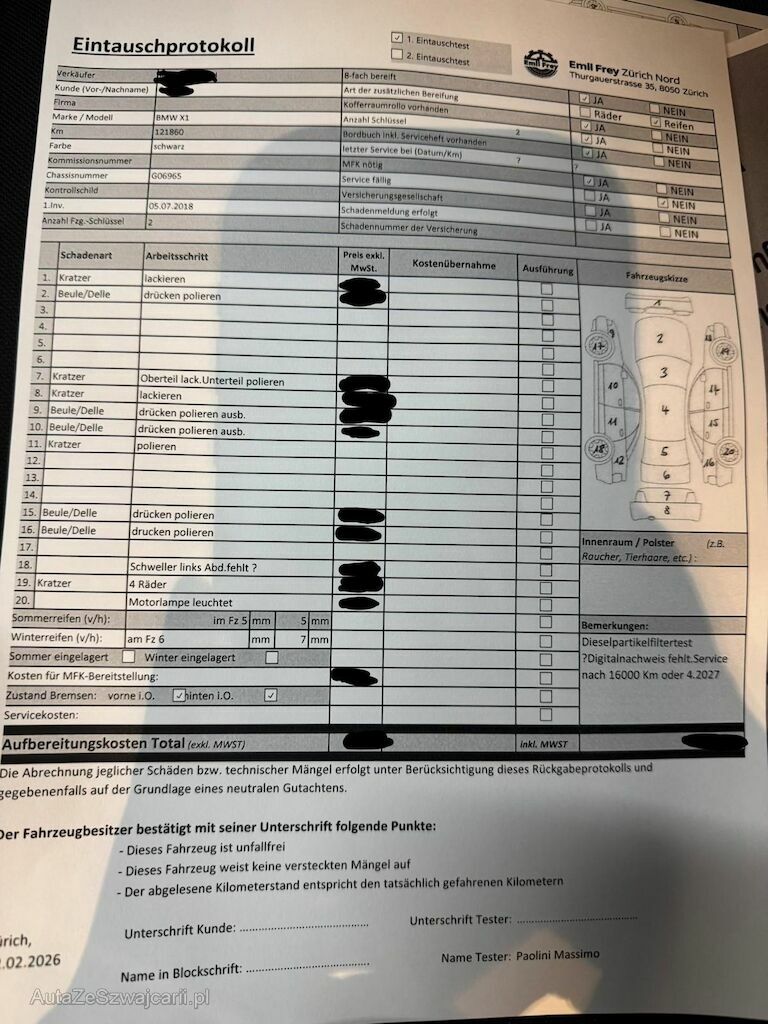 | Information | Keine technische Prüfung (Werkstatttest) vorgenommen Diverse Schäden an Karosserie/Lack. Fahrzeug ab Platz, ohne Garantie und Aufbereitung. DPF/FAP Filter nicht kontrolliert Keine Gewähr auf die Angaben der Sonder- und Serienausstattung / keine mechanische Prüfung. Fahrzeug wurde unzerlegt expertisiert / keine Haftung für allfällige, nach Demontage bekanntwerdenden Mängel. Fahrzeugbereifung und Ausstattung gemäss Fotos / Fahrzeugkauf auf eigenes Risiko ab Platz ohne Nachwährschaft. - Diverse Kratzer und Dellen am gesamten Fahrzeug. - Diverse Steinschläge an der Motorhaube - Alle 4 Räder verkratzt - Motorlampe leuchtet - Abdeckung der Schweller links fehlt |