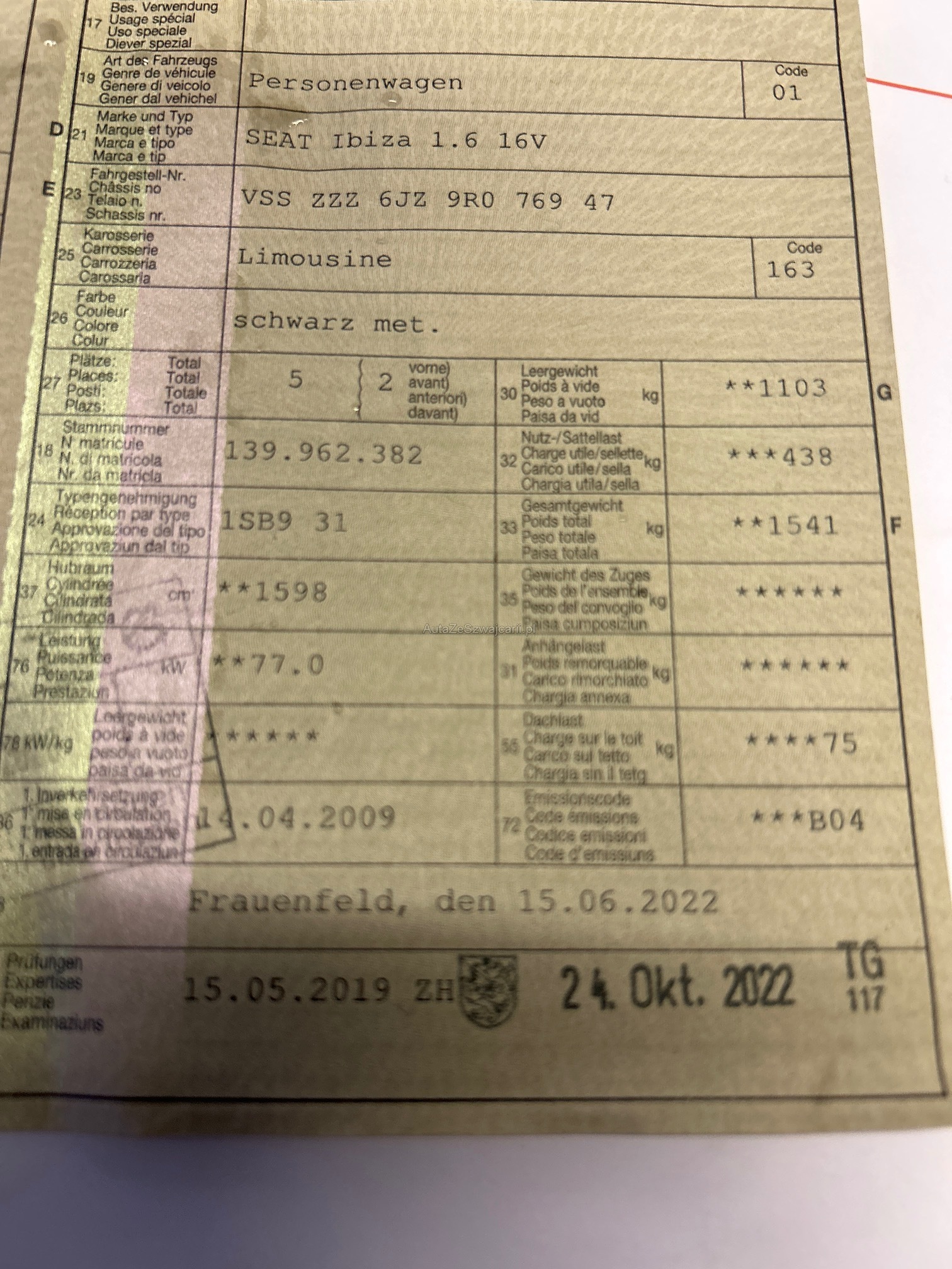 | Kommentar | Fahrzeug im Kundenauftrag. Am wurde kein Werkstatttest gemacht (Für sichtbare oder nicht sichtbare Mängel wird nicht gehaftet). Wir testen & kontrollieren nicht alle Funktionen des Fahrzeugs. Das Risiko liegt somit vollumfänglich beim Käufer. Nachdem der Höchstbietende den Zuschlag erhalten hat, gibt es keine Nachverhandlung, auch wenn nicht deklarierte Mängel zum Vorschein kommen sollten. Ab Platz ohne Garantie, Wandelung und Minderung werden wegbedungen. Fahrzeug im Kundenauftrag. Am Fahrzeug wurde kein Eintauschtest gemacht. Steuerkette rasselt |